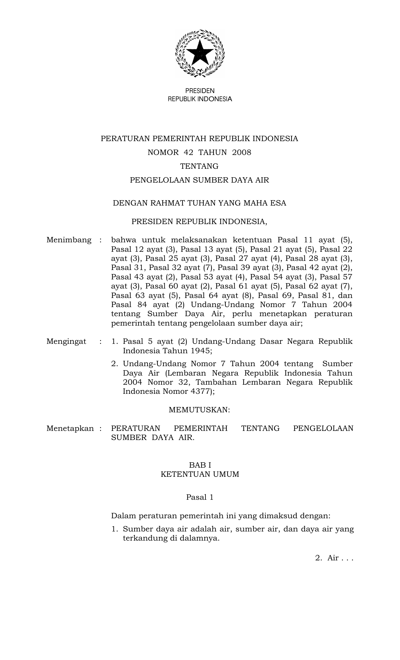 PP Nomor 42 Tahun 2008 | Peraturan Pemerintah Nomor 42 Tahun 2008 tentang PENGELOLAAN SUMBER DAYA AIR