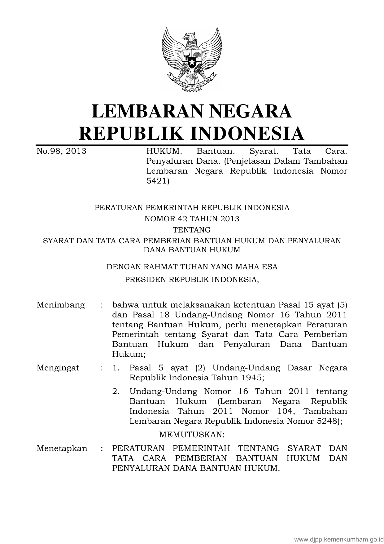 PP Nomor 42 Tahun 2013 | Peraturan Pemerintah Nomor 42 Tahun 2013 tentang SYARAT DAN TATA CARA PEMBERIAN BANTUAN HUKUM DAN PENYALURAN DANA BANTUAN HUKUM