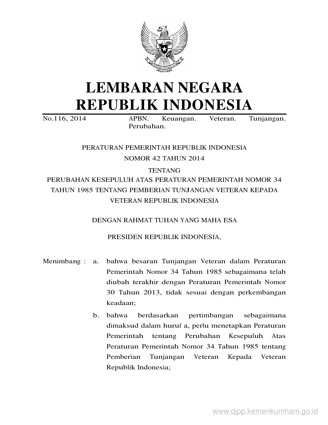 PP Nomor 42 Tahun 2014 | Peraturan Pemerintah Nomor 42 Tahun 2014 tentang PERUBAHAN KESEPULUH ATAS PERATURAN PEMERINTAH NOMOR 34 TAHUN 1985 TENTANG PEMBERIAN TUNJANGAN VETERAN KEPADA VETERAN REPUBLIK INDONESIA
