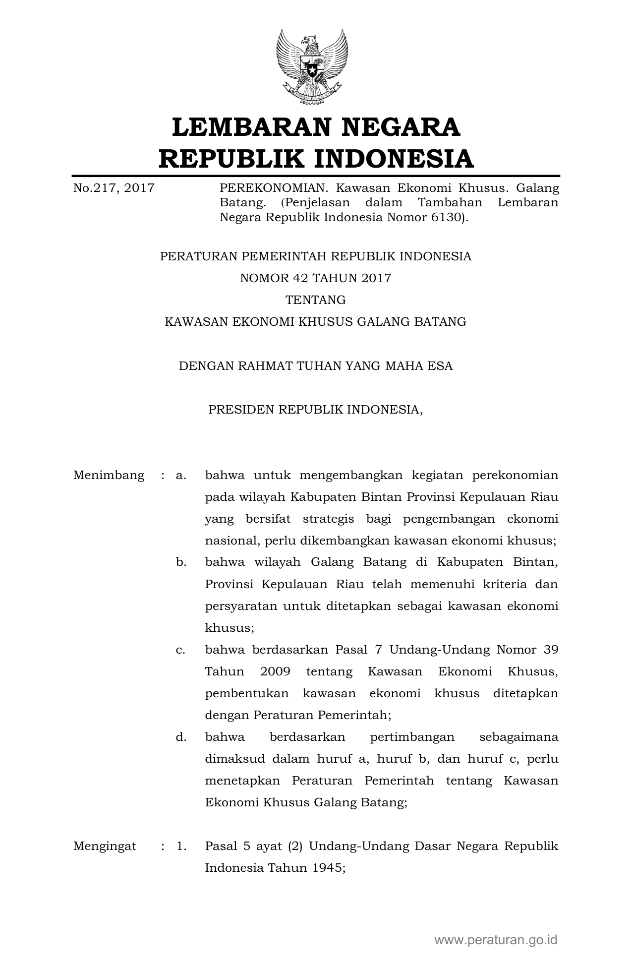 PP Nomor 42 Tahun 2017 | Peraturan Pemerintah Nomor 42 Tahun 2017 tentang Kawasan Ekonomi Khusus Galang Batang