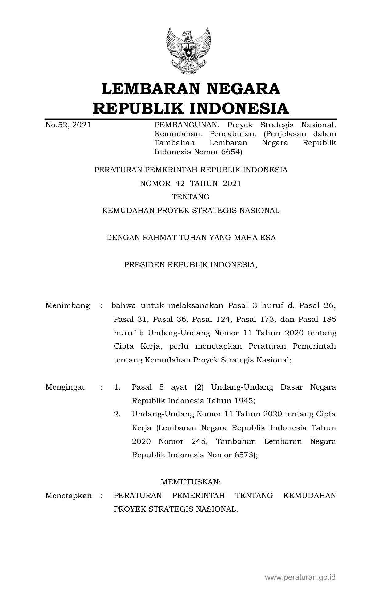PP Nomor 42 Tahun 2021 | Peraturan Pemerintah Nomor 42 Tahun 2021 tentang KEMUDAHAN PROYEK STRATEGIS NASIONAL