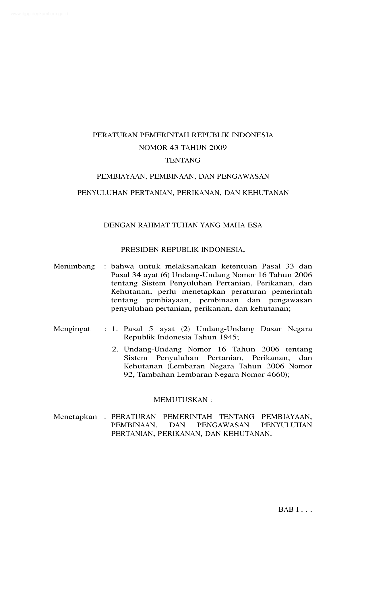 PP Nomor 43 Tahun 2009 | Peraturan Pemerintah Nomor 43 Tahun 2009 tentang PEMBIAYAAN, PEMBINAAN DAN PENGAWASAN PENYULUHAN PERTANIAN, PERIKANAN, DAN KEHUTANAN