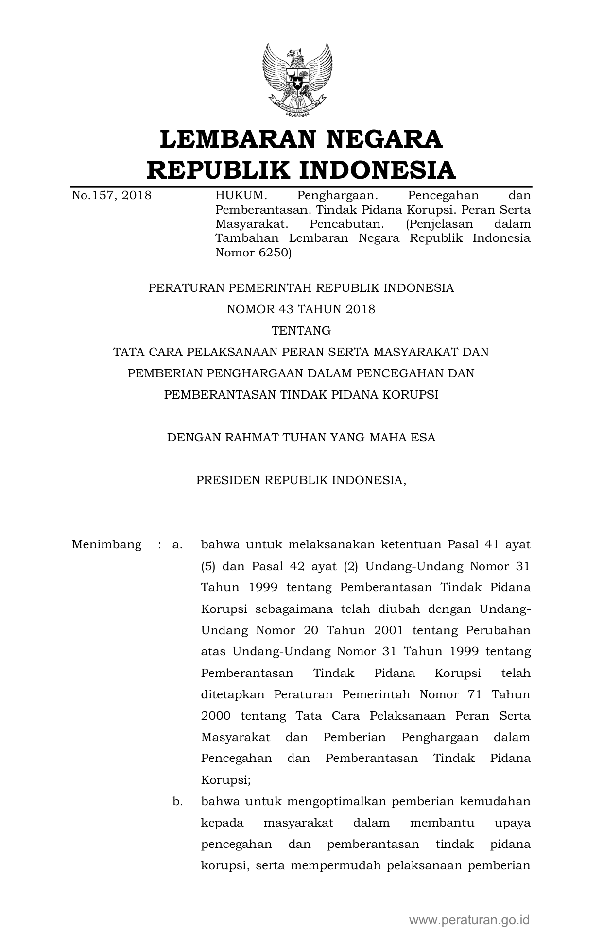 PP Nomor 43 Tahun 2018 | Peraturan Pemerintah Nomor 43 Tahun 2018 tentang Tata Cara Pelaksanaan Peran Serta Masyarakat dan Pemberian Penghargaan Dalam Pencegahan dan Pemberantasan Tindak Pidana Korupsi