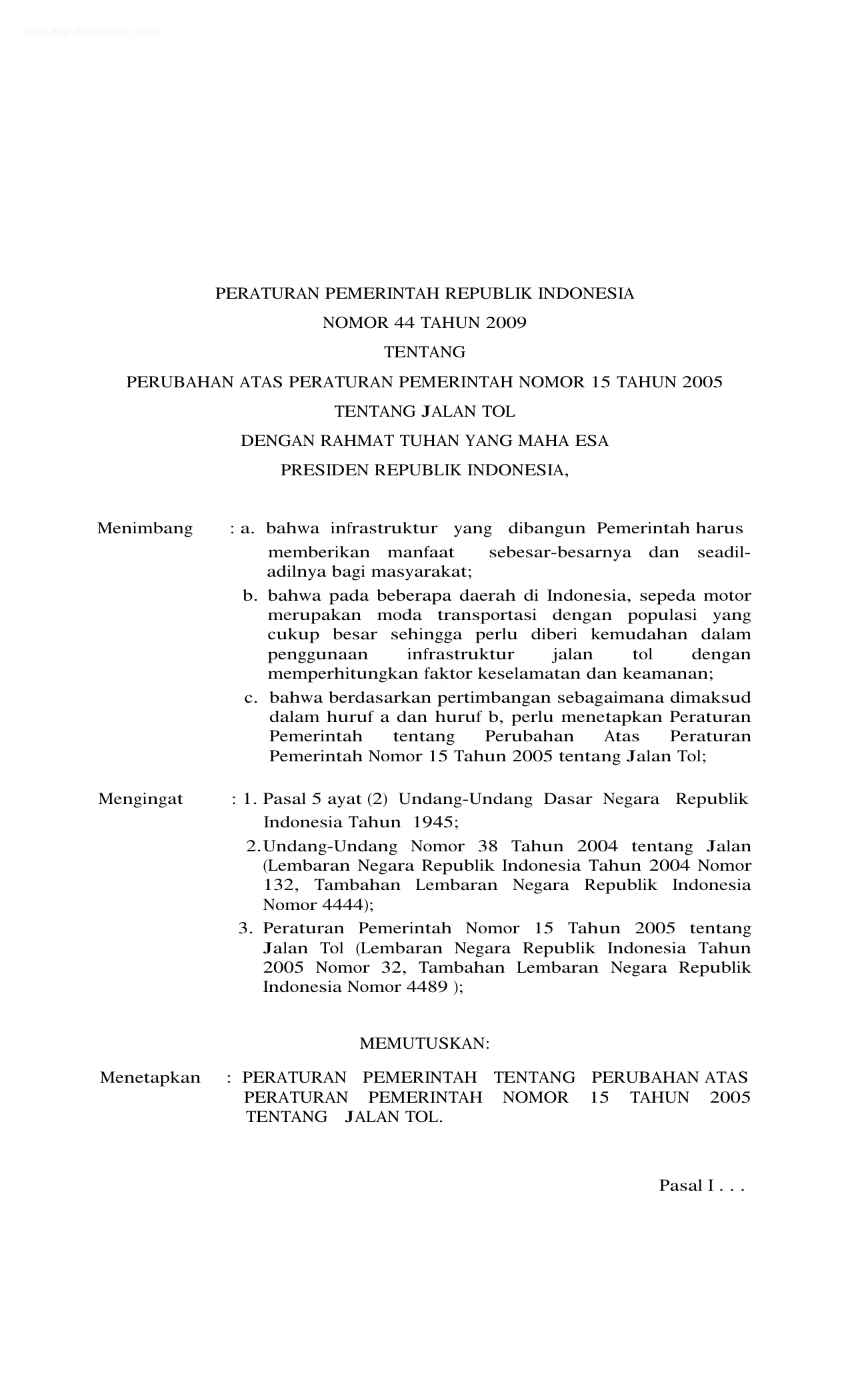 PP Nomor 44 Tahun 2009 | Peraturan Pemerintah Nomor 44 Tahun 2009 tentang PERUBAHAN PP 15-2005 TENTANG JALAN TOL