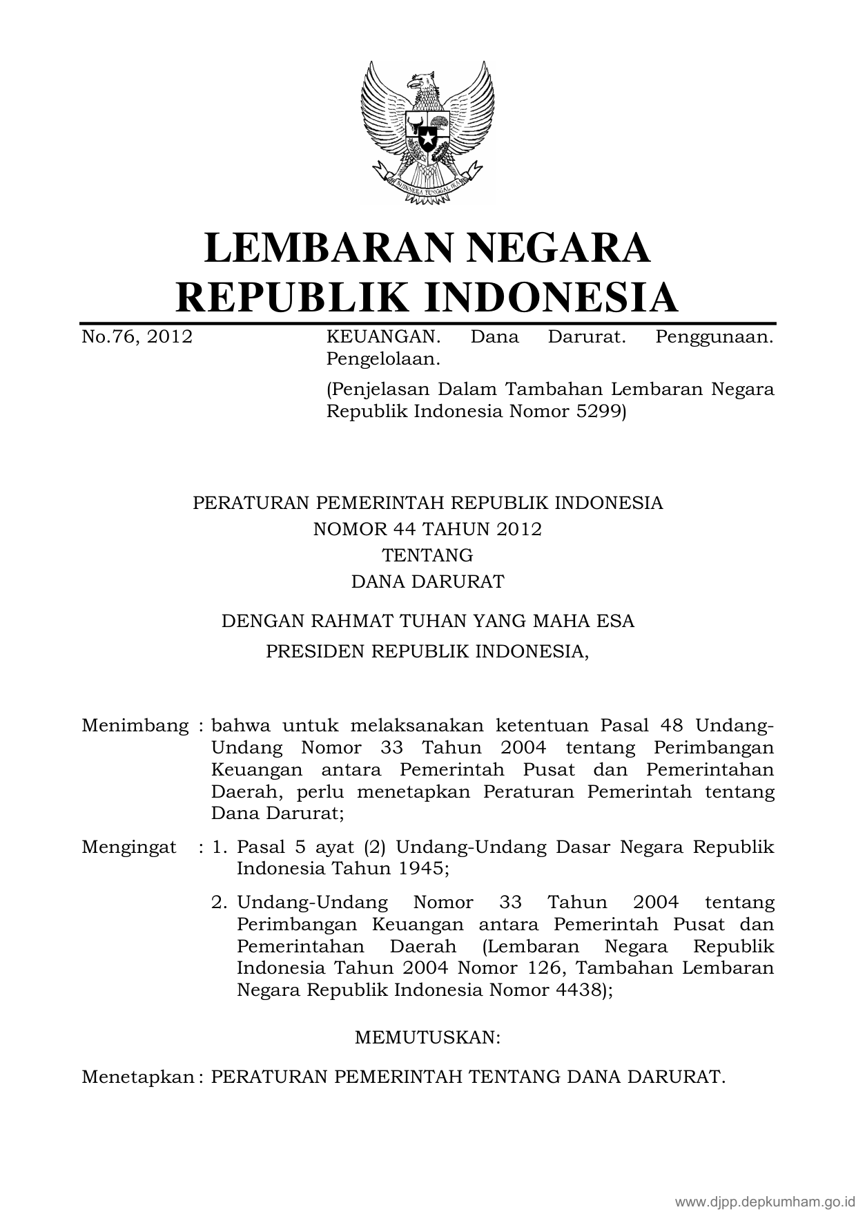 PP Nomor 44 Tahun 2012 | Peraturan Pemerintah Nomor 44 Tahun 2012 tentang DANA DARURAT