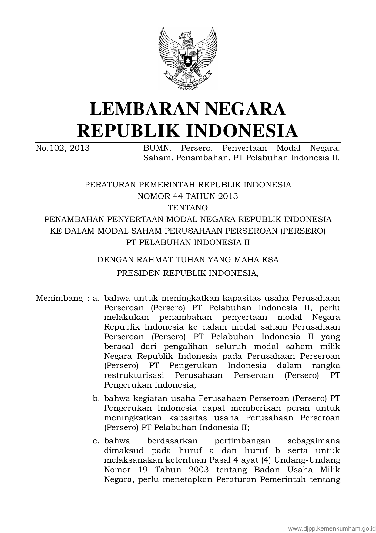 PP Nomor 44 Tahun 2013 | Peraturan Pemerintah Nomor 44 Tahun 2013 tentang PENAMBAHAN PENYERTAAN MODAL NEGARA REPUBLIK INDONESIA KE DALAM MODAL SAHAM PERSERO PT PELABUHAN INDONESIA II