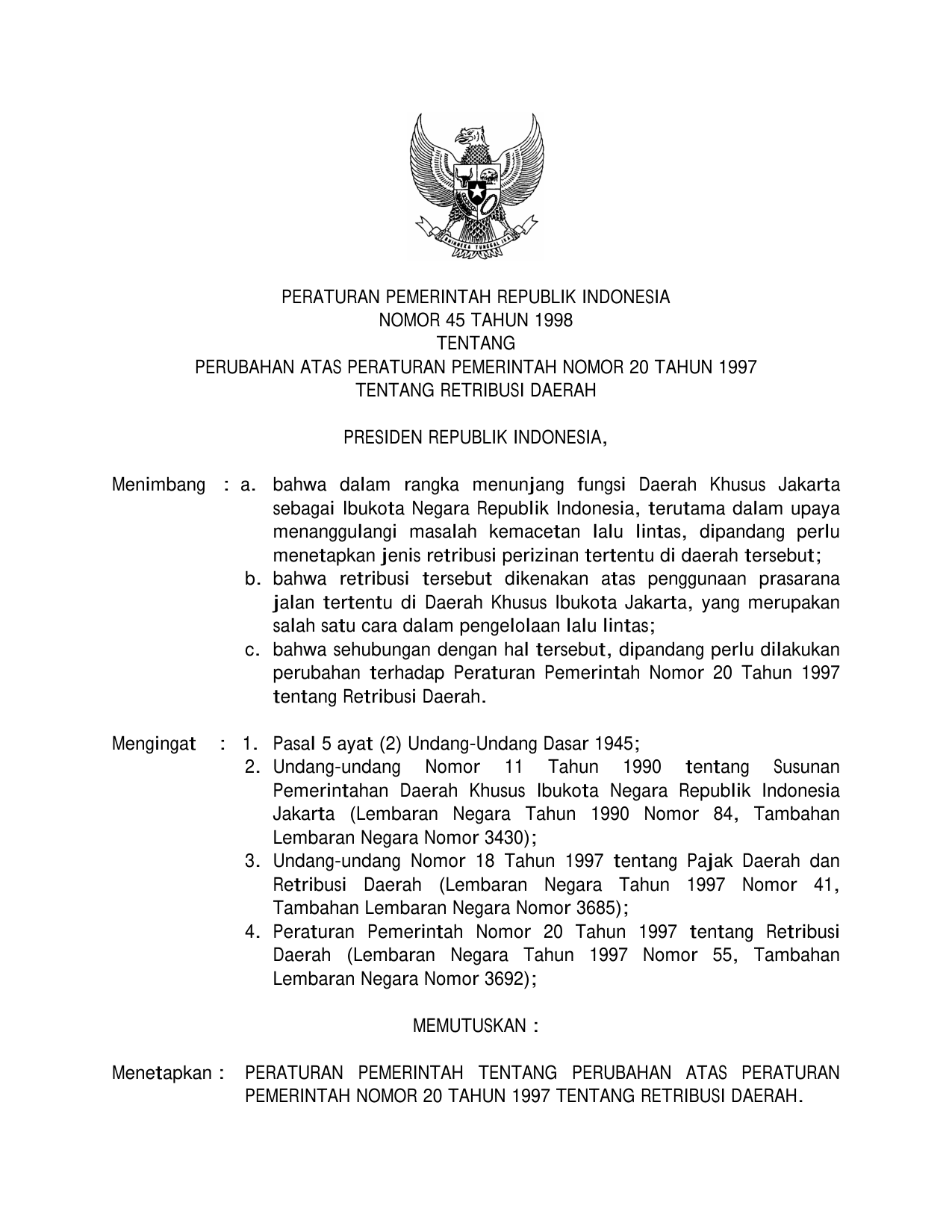 PP Nomor 45 Tahun 1998 | Peraturan Pemerintah Nomor 45 Tahun 1998 tentang PERUBAHAN PP 20-1997 TENTANG RETRIBUSI DAERAH