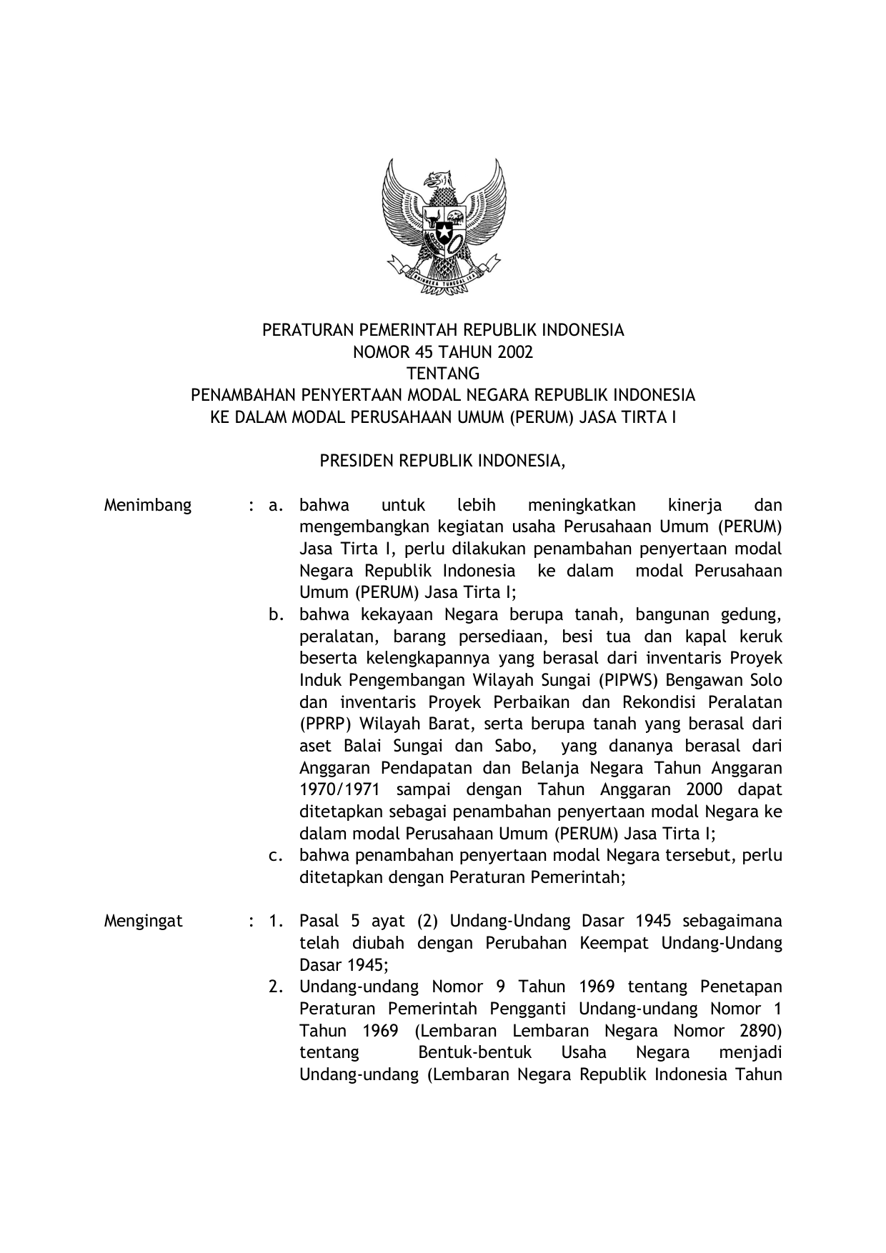 PP Nomor 45 Tahun 2002 | Peraturan Pemerintah Nomor 45 Tahun 2002 tentang PENAMBAHAN PENYERTAAN MODAL NEGARA RI KE DALAM MODAL PERUSAHAAN UMUM (PERUM) JASA TIRTA I