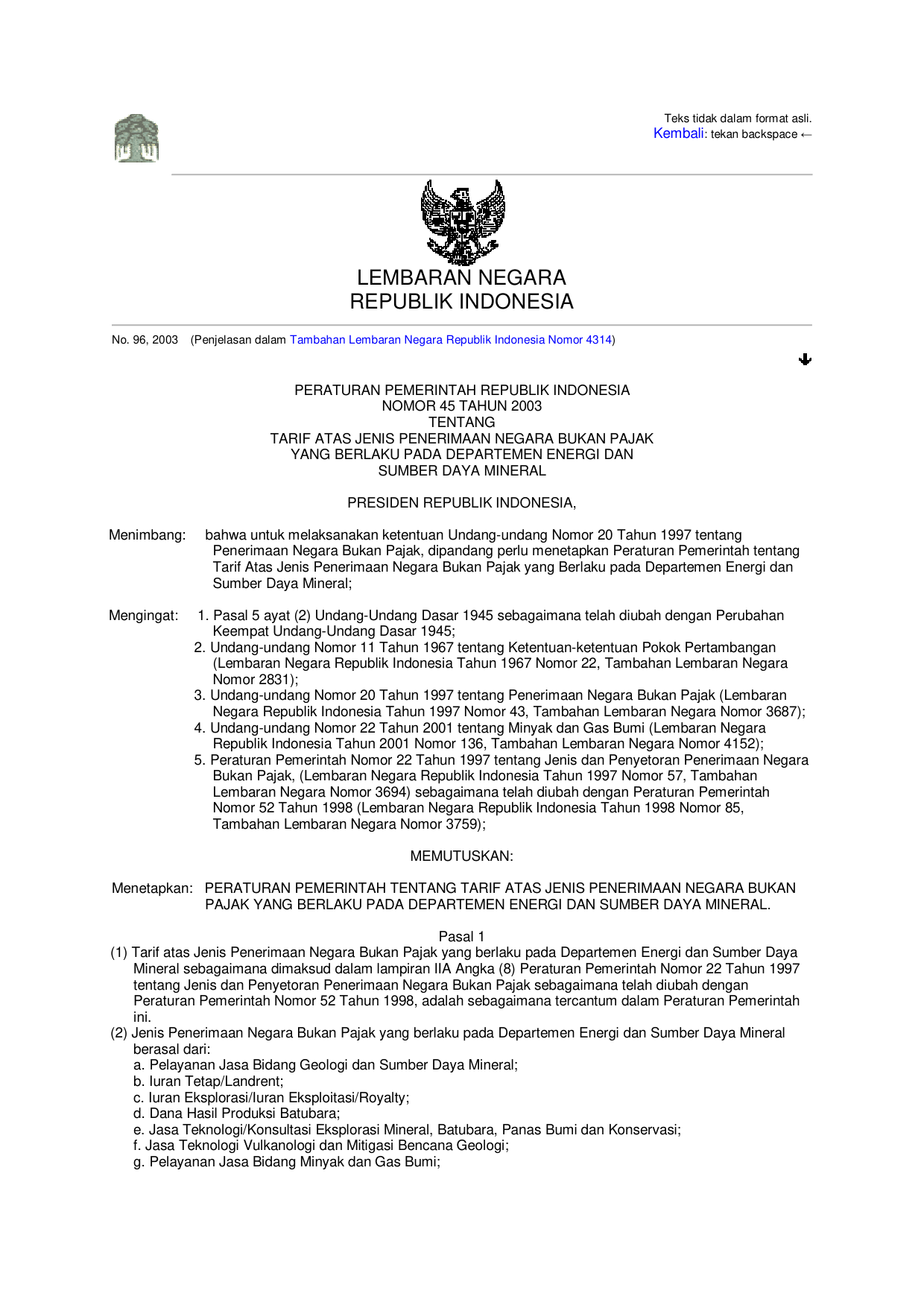 PP Nomor 45 Tahun 2003 | Peraturan Pemerintah Nomor 45 Tahun 2003 tentang TARIF ATAS JENIS PENERIMAAN NEGARA BUKAN PAJAK YANG BERLAKU PADA DEPARTEMEN ENERGI DAN SUMBER DAYA MINERAL