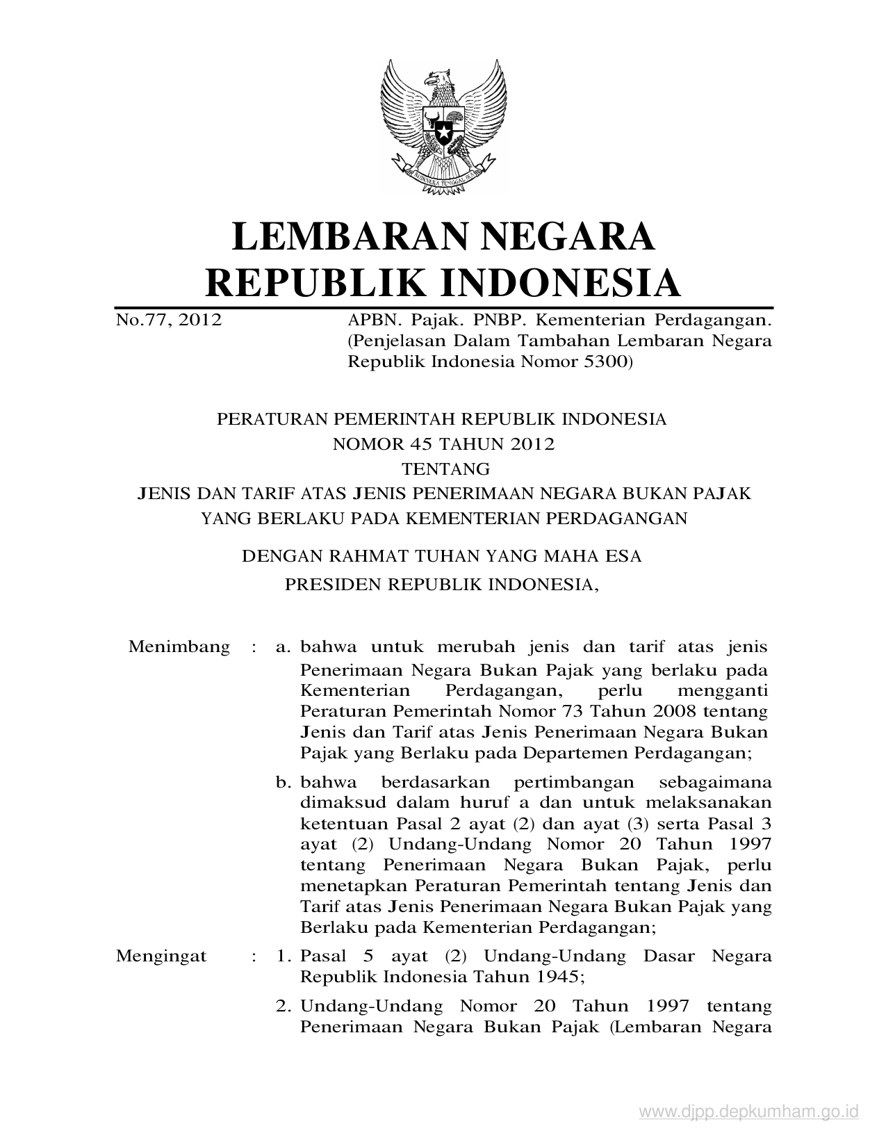PP Nomor 45 Tahun 2012 | Peraturan Pemerintah Nomor 45 Tahun 2012 tentang JENIS DAN TARIF ATAS JENIS PNBP YANG BERLAKU PADA KEMENTERIAN PERDAGANGAN