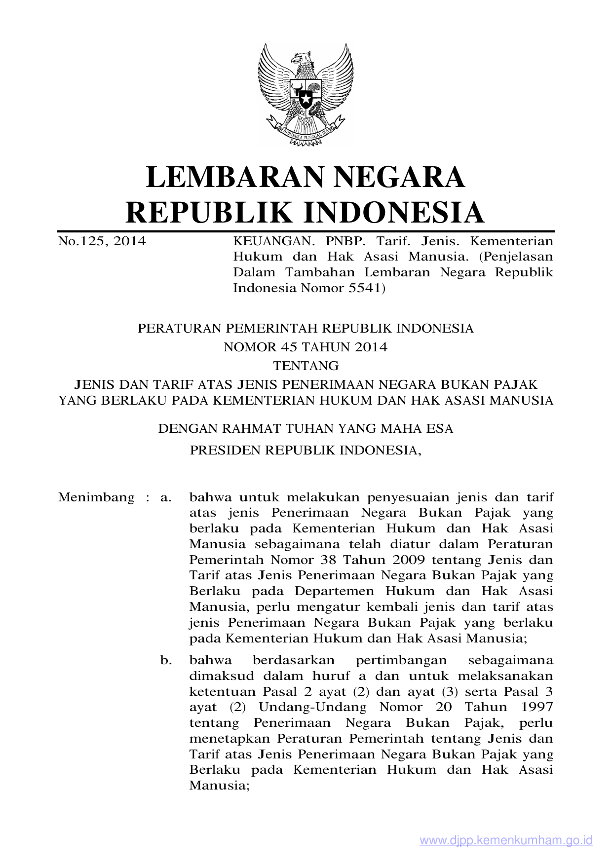 PP Nomor 45 Tahun 2014 | Peraturan Pemerintah Nomor 45 Tahun 2014 tentang JENIS DAN TARIF ATAS JENIS PENERIMAAN NEGARA BUKAN PAJAK YANG BERLAKU PADA KEMENTERIAN HUKUM DAN HAK ASASI MANUSIA