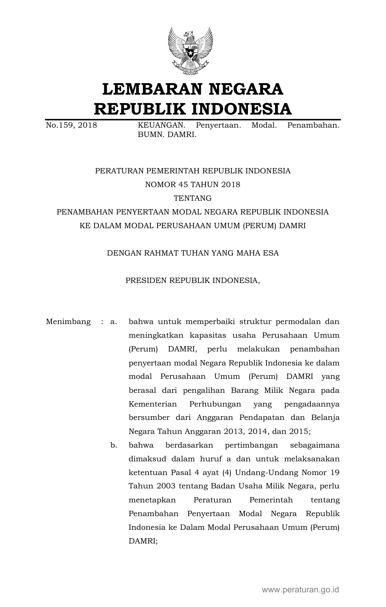 PP Nomor 45 Tahun 2018 | Peraturan Pemerintah Nomor 45 Tahun 2018 tentang Penambahan Penyertaan Modal Negara Republik Indonesia Ke Dalam Modal Perusahaan Umum (Perum) Damri