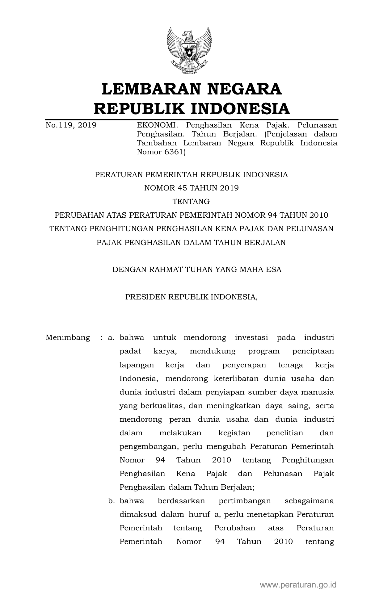 PP Nomor 45 Tahun 2019 | Peraturan Pemerintah Nomor 45 Tahun 2019 tentang PERUBAHAN ATAS PERATURAN PEMERINTAH NOMOR 94 TAHUN 2010 TENTANG PENGHITUNGAN PENGHASILAN KENA PAJAK DAN PELUNASAN PAJAK PENGHASILAN DALAM TAHUN BERJALAN