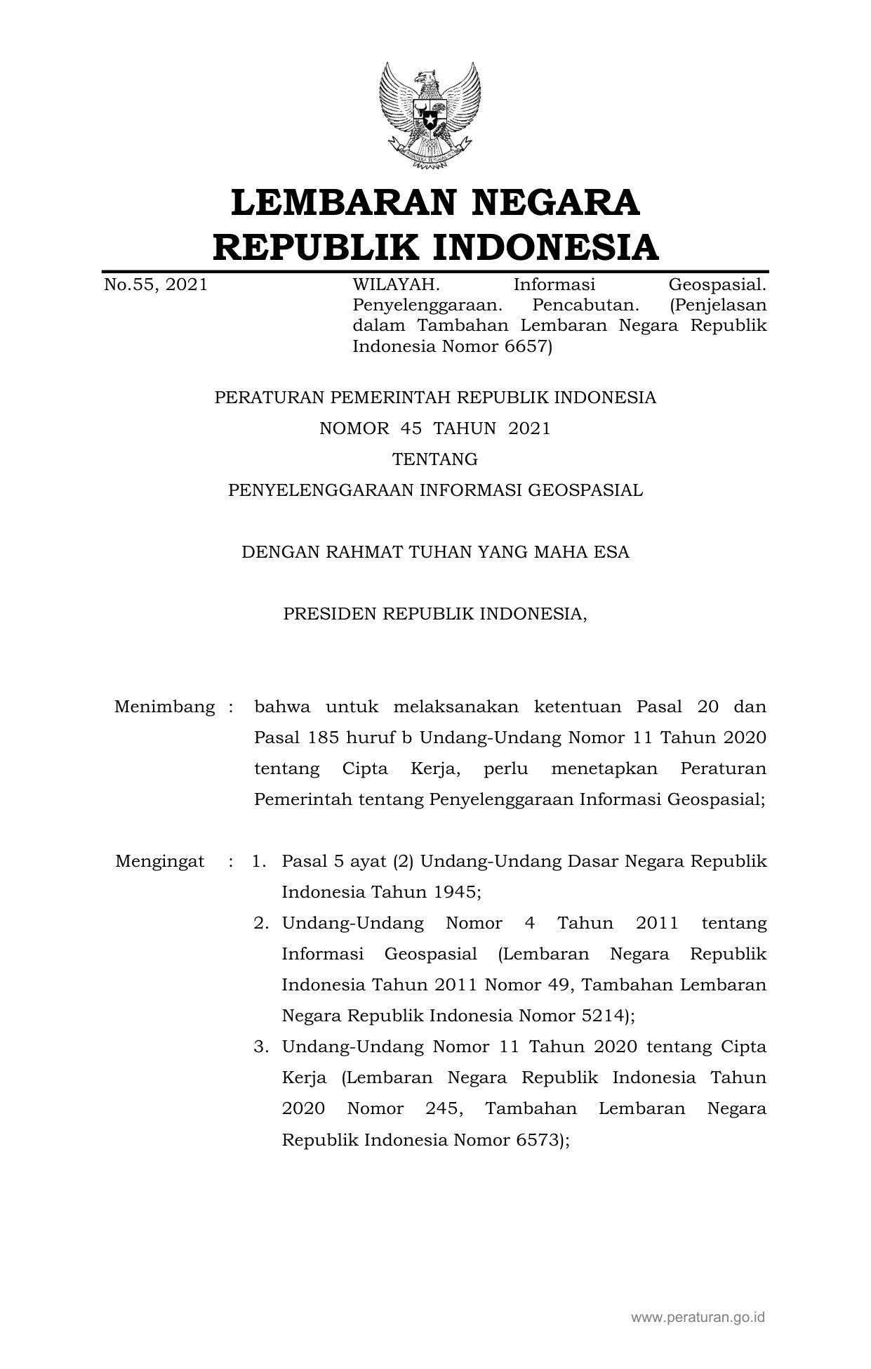 PP Nomor 45 Tahun 2021 | Peraturan Pemerintah Nomor 45 Tahun 2021 tentang PENYELENGGARAAN INFORMASI GEOSPASIAL