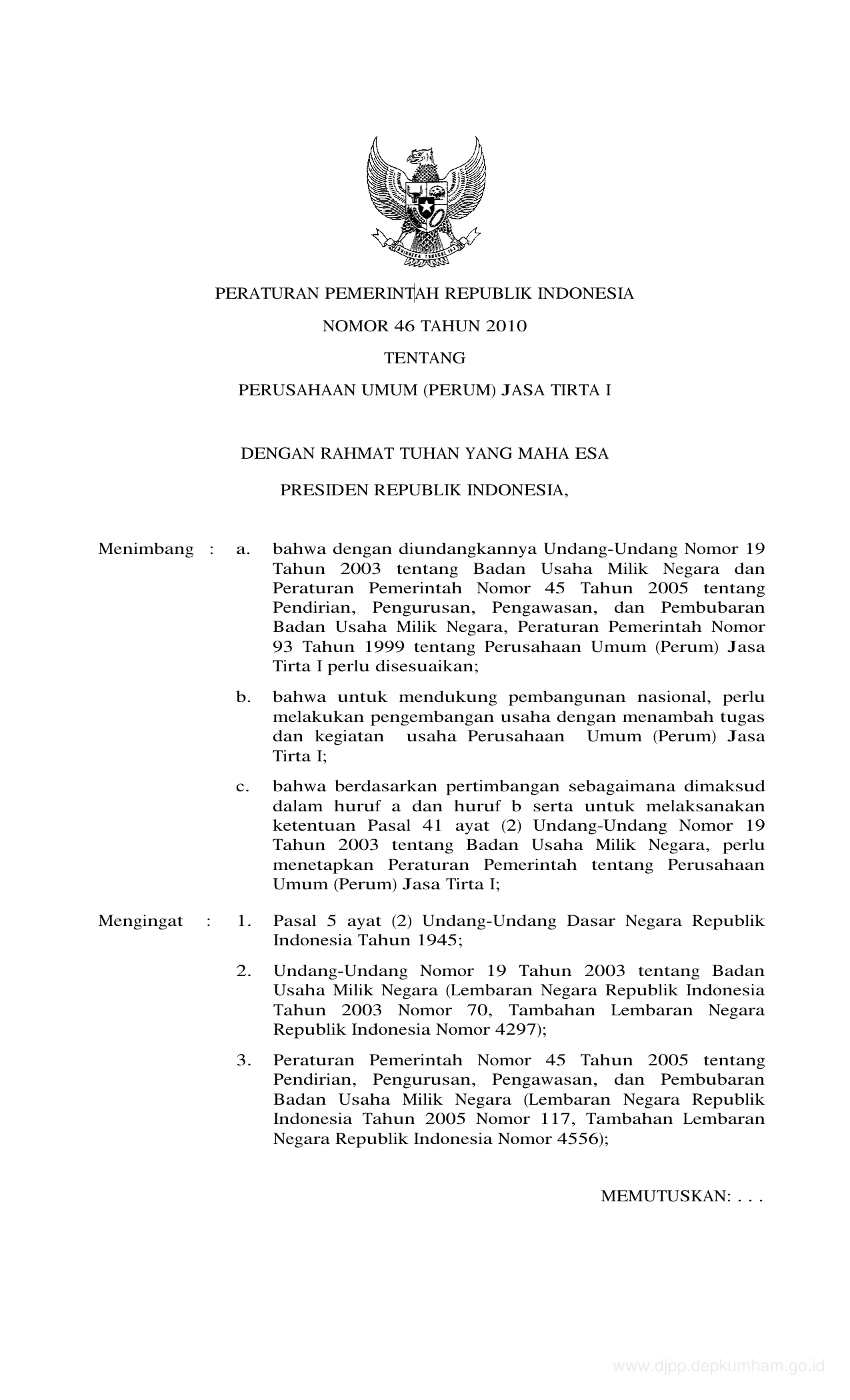 PP Nomor 46 Tahun 2010 | Peraturan Pemerintah Nomor 46 Tahun 2010 tentang PERUSAHAAN UMUM (PERUM) JASA TIRTA I