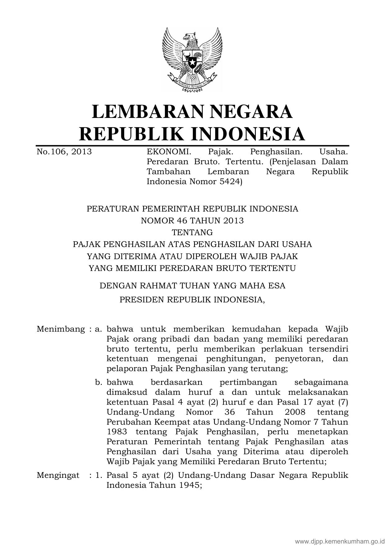 PP Nomor 46 Tahun 2013 | Peraturan Pemerintah Nomor 46 Tahun 2013 tentang PAJAK PENGHASILAN ATAS PENGHASILAN DARI USAHA YANG DITERIMA ATAU DIPEROLEH WAJIB PAJAK YANG MEMILIKI PEREDARAN BRUTO TERTENTU