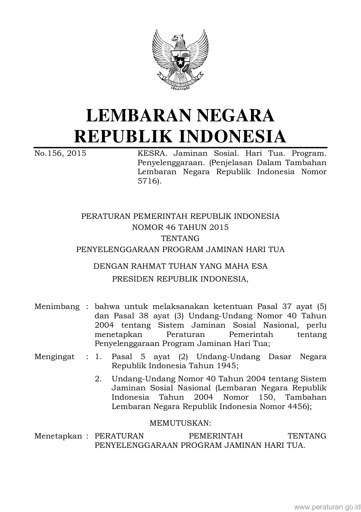 PP Nomor 46 Tahun 2015 | Peraturan Pemerintah Nomor 46 Tahun 2015 tentang PENYELENGGARAAN PROGRAM JAMINAN HARI TUA