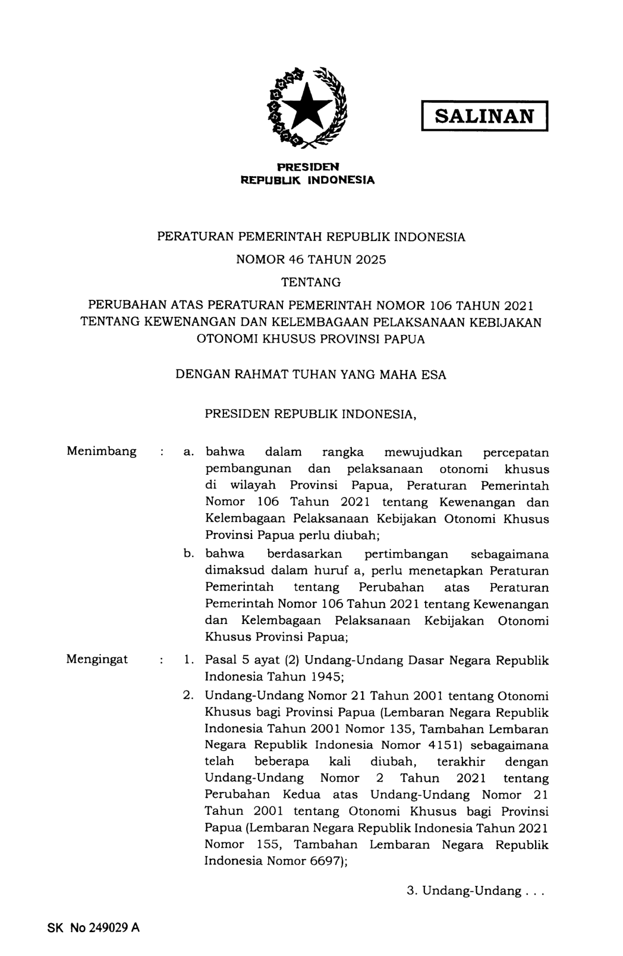 PP Nomor 46 Tahun 2025 | Peraturan Pemerintah Nomor 46 Tahun 2025 tentang Perubahan Atas Peraturan Pemerintah Nomor 106 Tahun 2021 Tentang Kewenangan dan Kelembagaan Pelaksanaan Kebijakan Otonomi Khusus Provinsi Papua