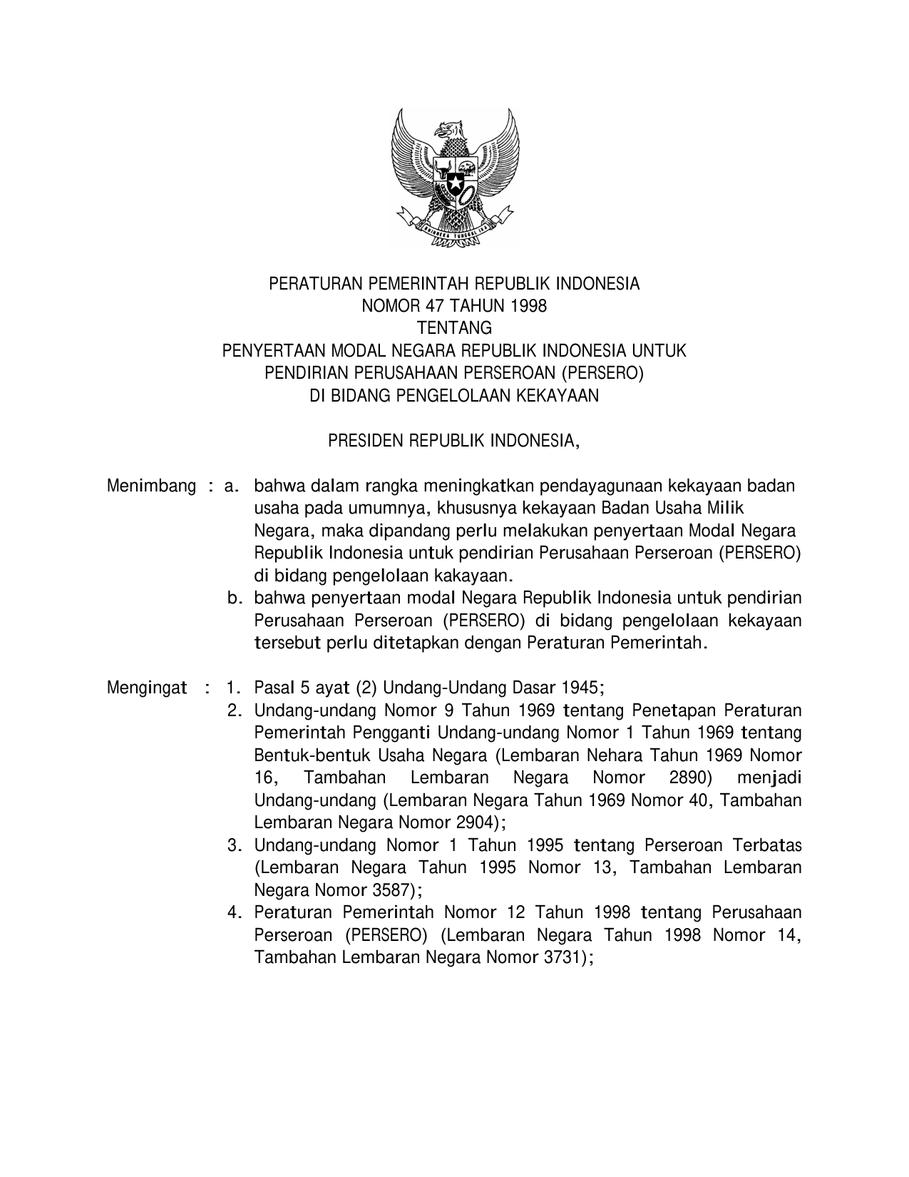 PP Nomor 47 Tahun 1998 | Peraturan Pemerintah Nomor 47 Tahun 1998 tentang PENYERTAAN MODAL NEGARA RI UNTUK PENDIRIAN PERUSAHAAN PERSEROAN (PERSERO) DI BIDANG PENGELOLAAN KEKAYAAN