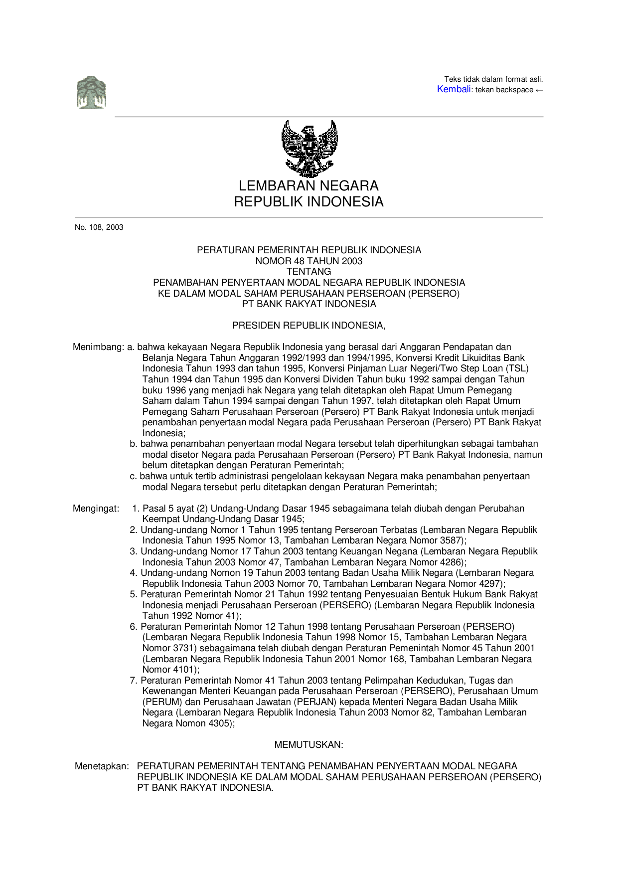 PP Nomor 48 Tahun 2003 | Peraturan Pemerintah Nomor 48 Tahun 2003 tentang PENAMBAHAN PENYERTAAN MODAL NEGARA RI KE DALAM MODAL SAHAM PERUSAHAAN PERSEROAN (PERSERO) PT BANK RAKYAT INDONESIA