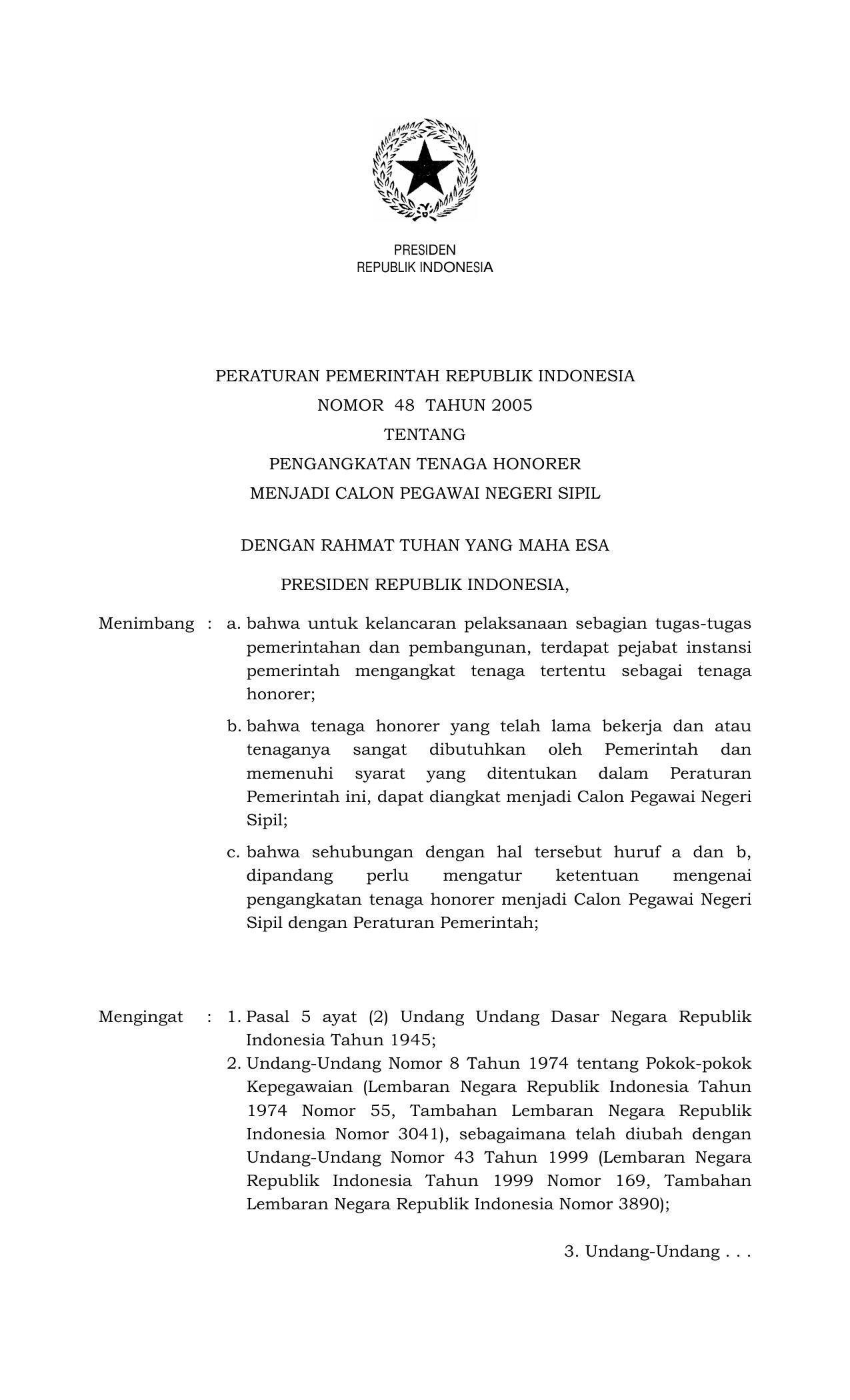 PP Nomor 48 Tahun 2005 | Peraturan Pemerintah Nomor 48 Tahun 2005 tentang PENGANGKATAN TENAGA HONORER MENJADI CALON PEGAWAI NEGERI SIPIL