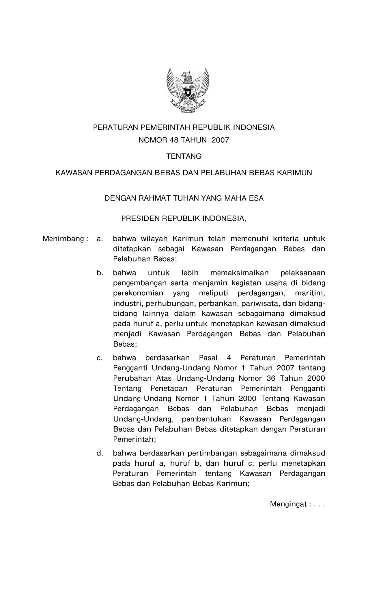 PP Nomor 48 Tahun 2007 | Peraturan Pemerintah Nomor 48 Tahun 2007 tentang KAWASAN PERDAGANGAN BEBAS DAN PELABUHAN BEBAS KARIMUN