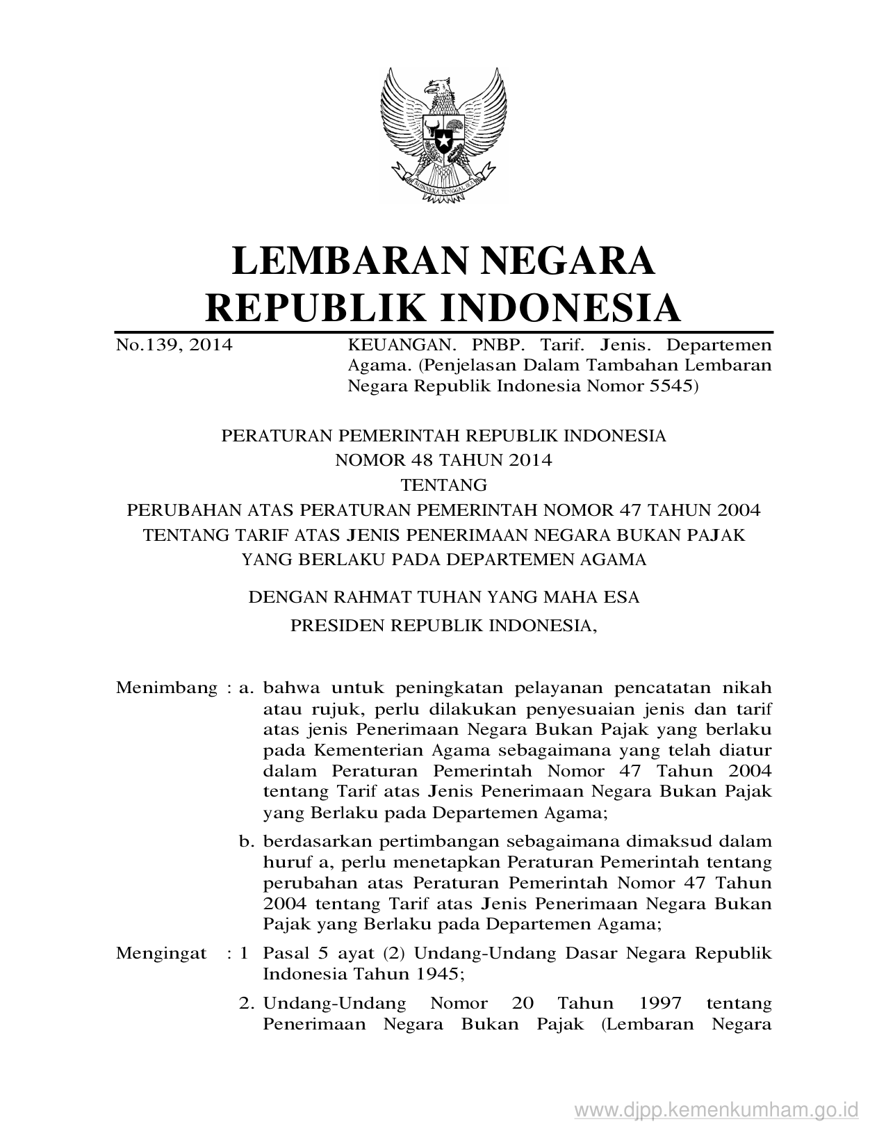 PP Nomor 48 Tahun 2014 | Peraturan Pemerintah Nomor 48 Tahun 2014 tentang PERUBAHAN ATAS PERATURAN PEMERINTAH NOMOR 47 TAHUN 2004 TENTANG TARIF ATAS JENIS PENERIMAAN NEGARA BUKAN PAJAK YANG BERLAKU PADA DEPARTEMEN AGAMA