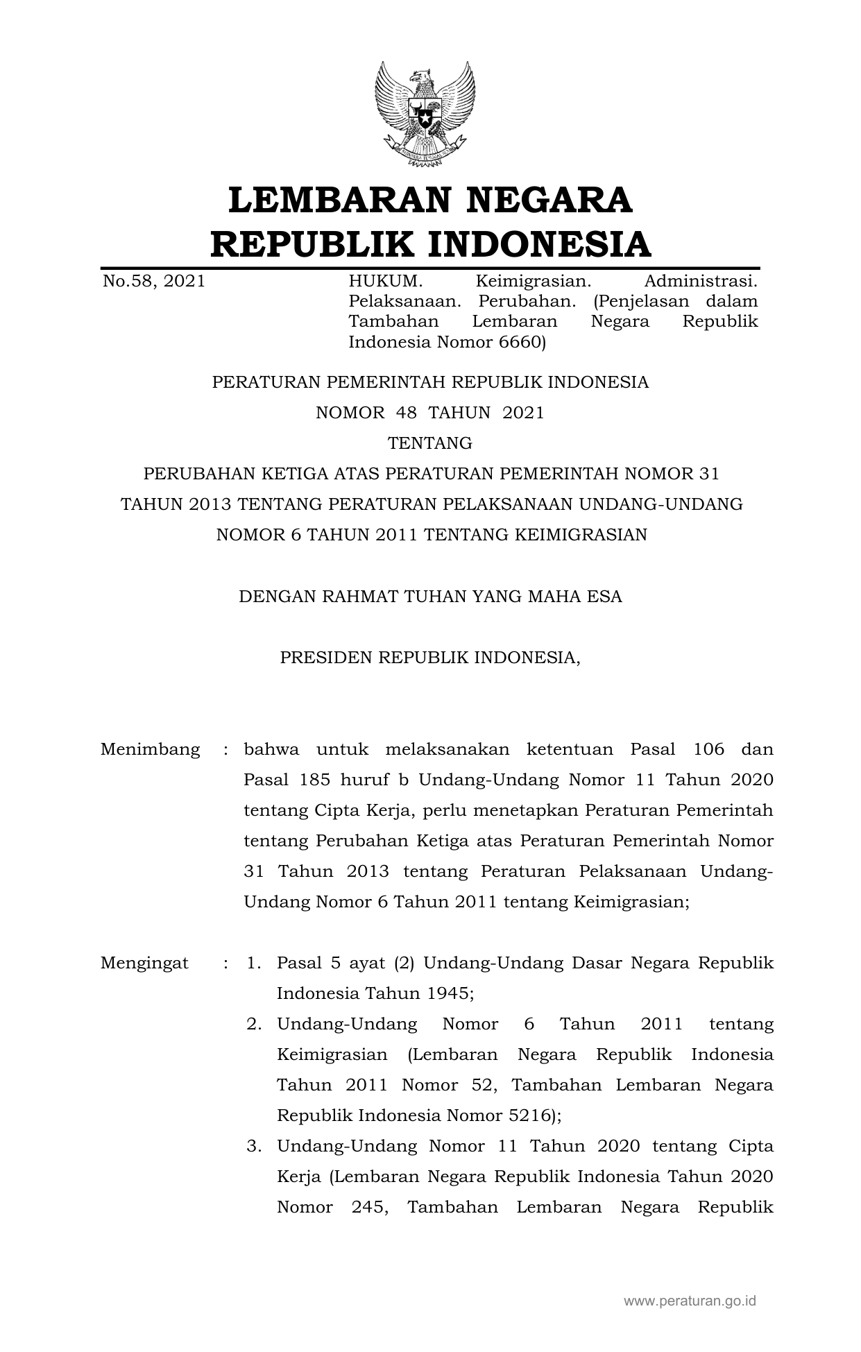 PP Nomor 48 Tahun 2021 | Peraturan Pemerintah Nomor 48 Tahun 2021 tentang PERUBAHAN KETIGA ATAS PERATURAN PEMERINTAH NOMOR 31 TAHUN 2013 TENTANG PERATURAN PELAKSANAAN UNDANG-UNDANG NOMOR 6 TAHUN 2011 TENTANG KEIMIGRASIAN