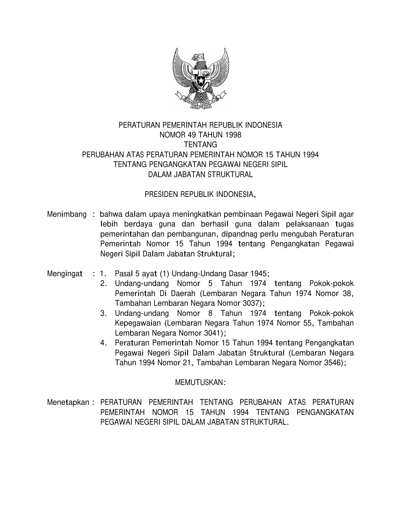 PP Nomor 49 Tahun 1998 | Peraturan Pemerintah Nomor 49 Tahun 1998 tentang PERUBAHAN PP 15-1994 TENTANG PENGANGKATAN PEGAWAI NEGERI SIPIL DALAM JABATAN STRUKTURAL