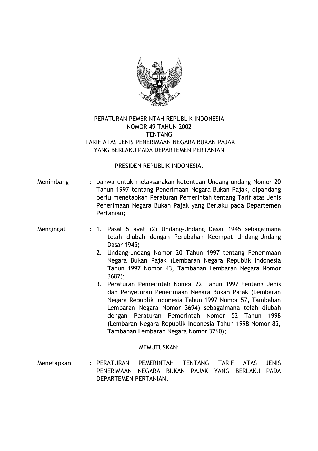 PP Nomor 49 Tahun 2002 | Peraturan Pemerintah Nomor 49 Tahun 2002 tentang TARIF ATAS JENIS PENERIMAAN NEGARA BUKAN PAJAK YANG BERLAKU PADA DEPARTEMEN PERTANIAN