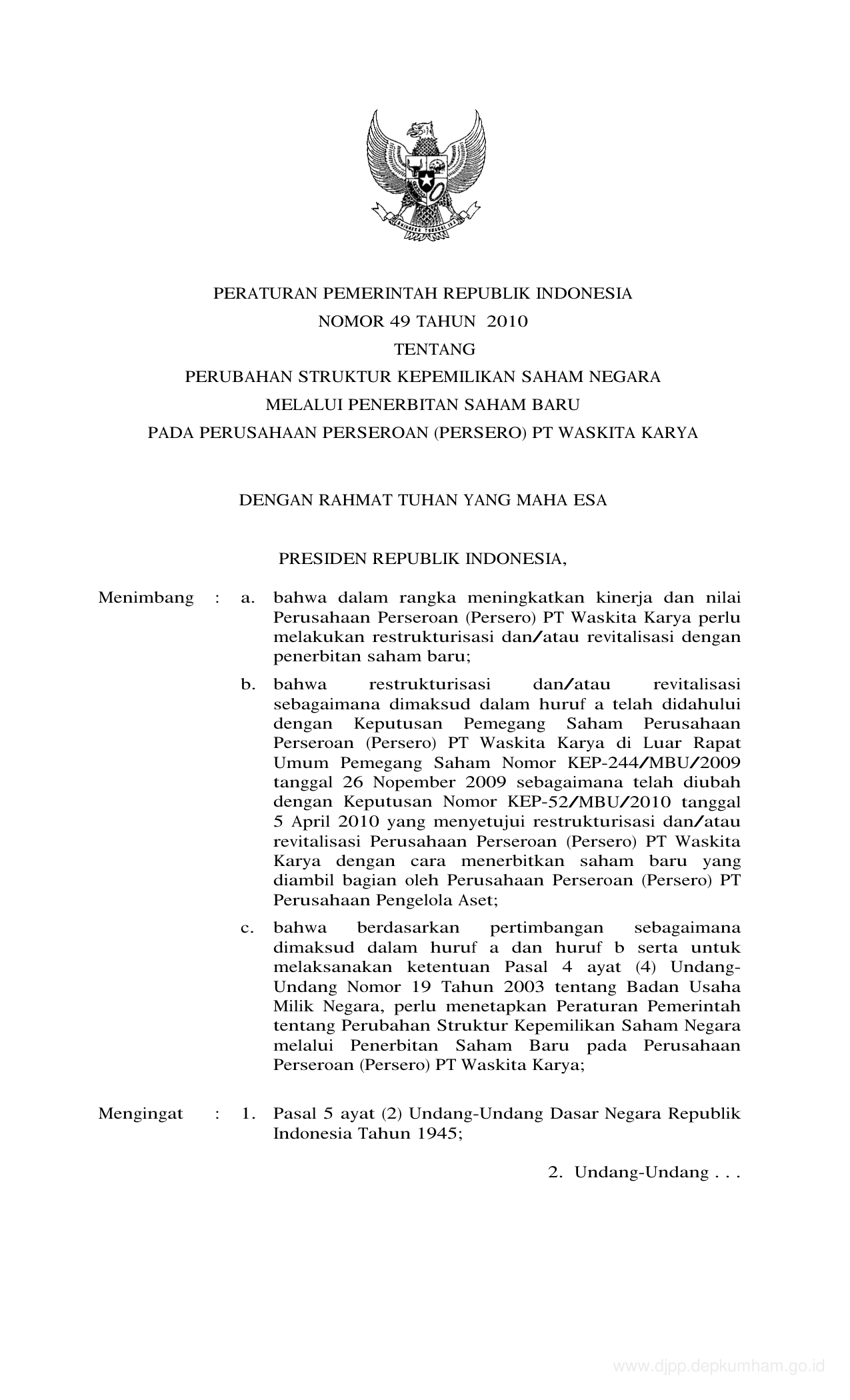 PP Nomor 49 Tahun 2010 | Peraturan Pemerintah Nomor 49 Tahun 2010 tentang PERUBAHAN STRUKTUR KEPEMILIKAN SAHAM NEGARA MELALUI PENERBITAN SAHAM BARU PADA PERUSAHAAN PERSEROAN (PERSERO) PT WASKITA KARYA