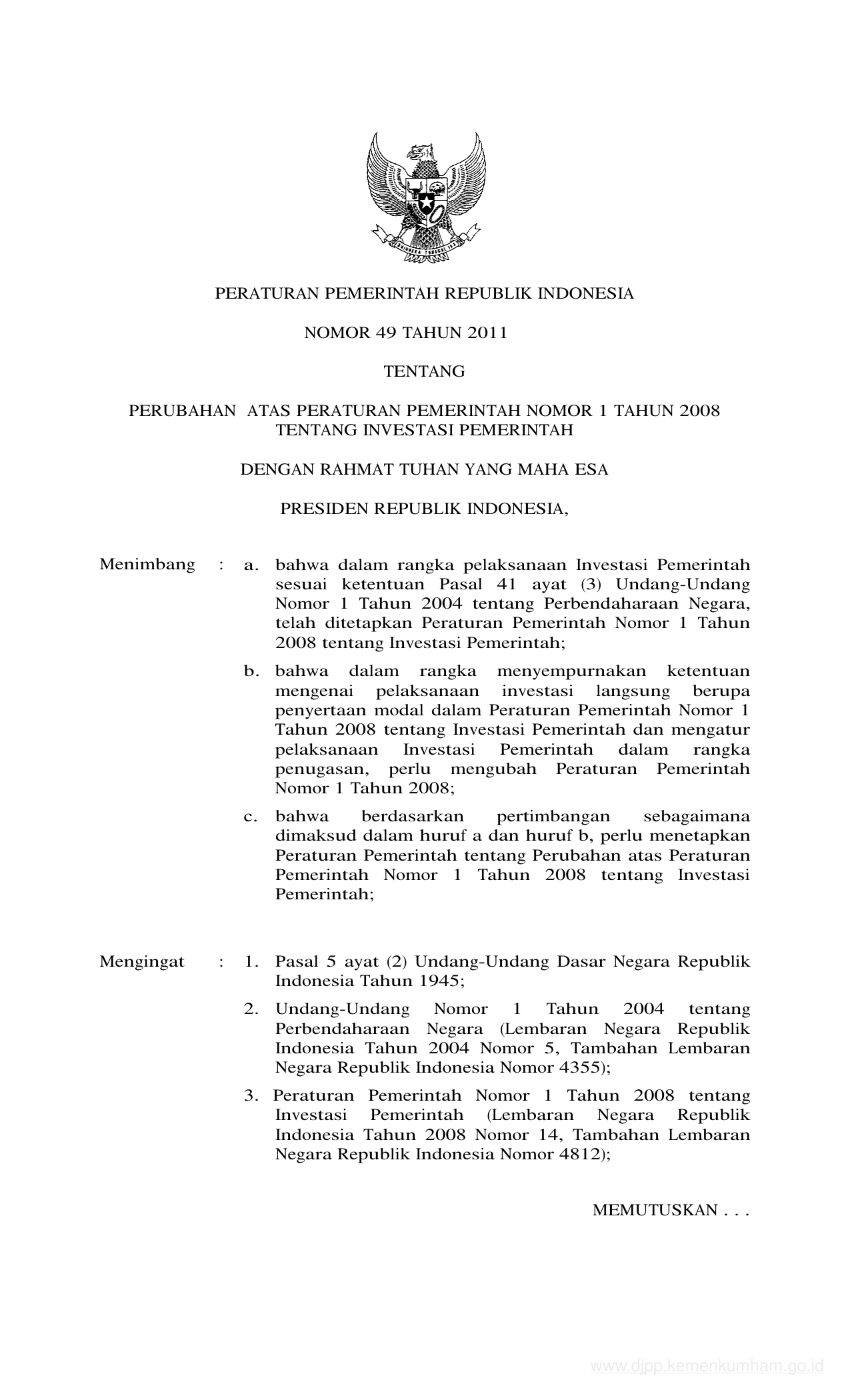 PP Nomor 49 Tahun 2011 | Peraturan Pemerintah Nomor 49 Tahun 2011 tentang PERUBAHAN ATAS PERATURAN PEMERINTAH NOMOR 1 TAHUN 2008 TENTANG INVESTASI PEMERINTAH