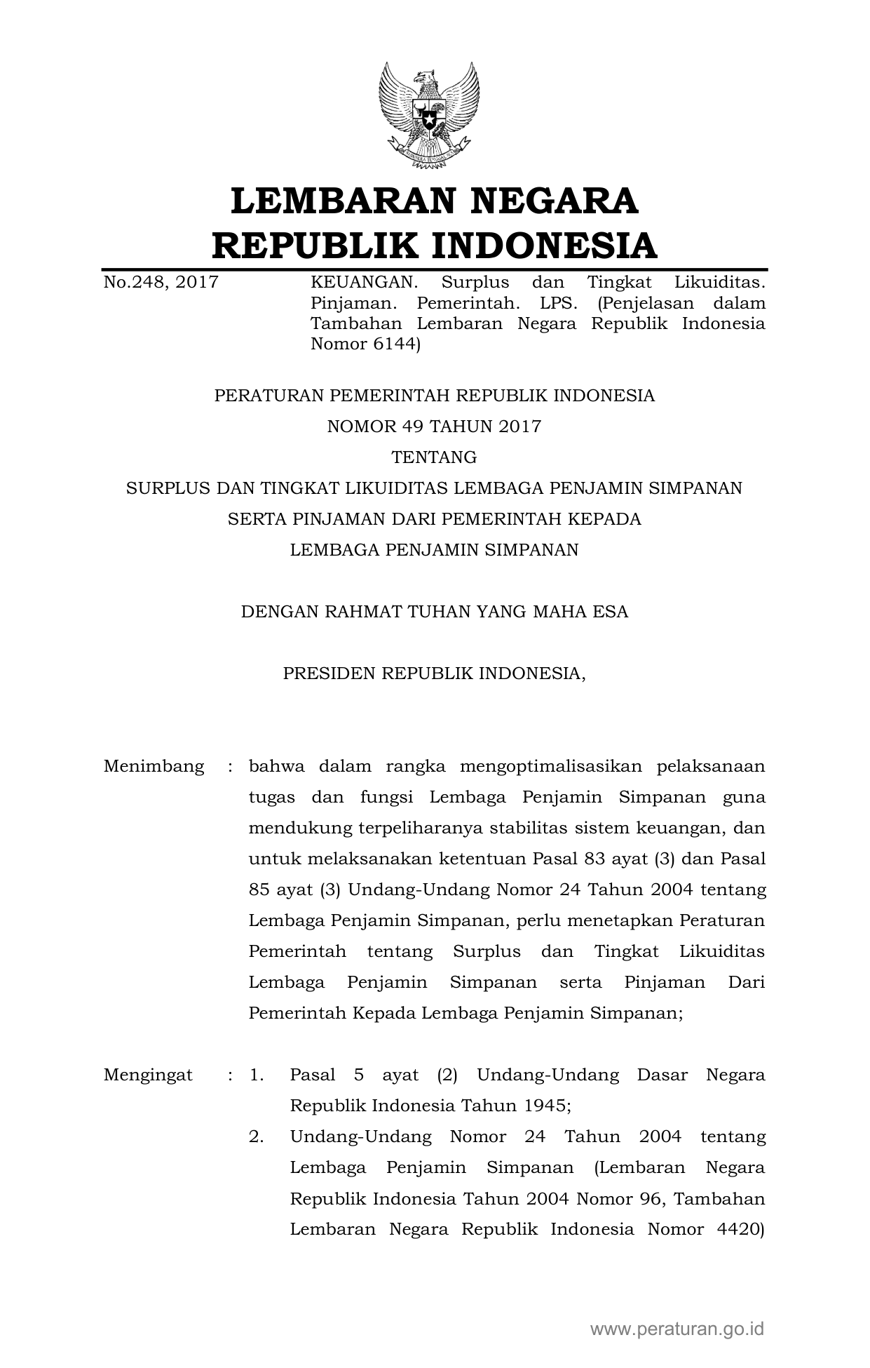 PP Nomor 49 Tahun 2017 | Peraturan Pemerintah Nomor 49 Tahun 2017 tentang Surplus dan Tingkat Likuiditas Lembaga Penjamin Simpanan Serta Pinjaman dari Pemerintah Kepada Lembaga Penjamin Simpanan