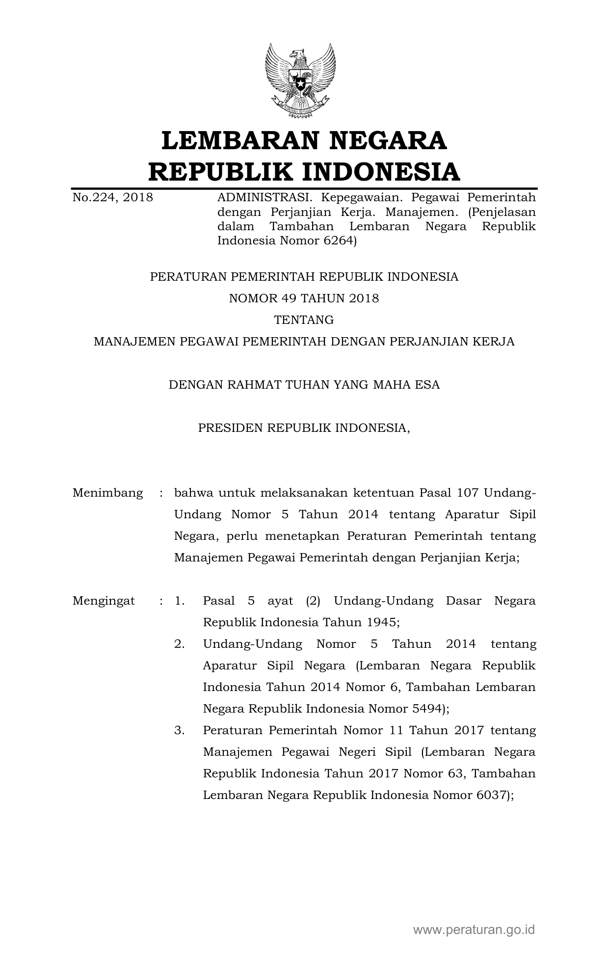 PP Nomor 49 Tahun 2018 | Peraturan Pemerintah Nomor 49 Tahun 2018 tentang Manajemen Pegawai Pemerintah Dengan Perjanjian Kerja