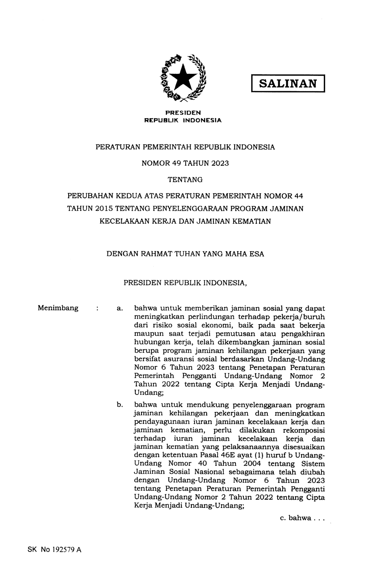 PP Nomor 49 Tahun 2023 | Peraturan Pemerintah Nomor 49 Tahun 2023 tentang PERUBAHAN KEDUA ATAS PERATURAN PEMERINTAH NOMOR 44 TAHUN 2015 TENTANG PENYELENGGARAAN PROGRAM JAMINAN KECELAKAAN KERJA DAN JAMINAN KEMATIAN