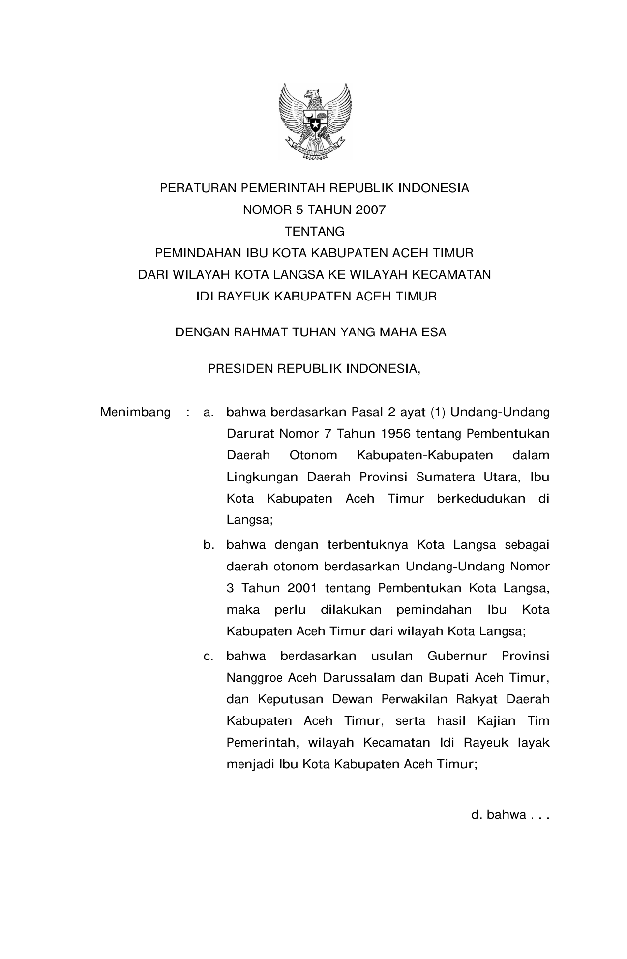 PP Nomor 5 Tahun 2007 | Peraturan Pemerintah Nomor 5 Tahun 2007 tentang PEMINDAHAN IBUKOTA KABUPATEN ACEH TIMUR DARI WIILAYAH KOTA LANGSA KE WILAYAH KECAMATAN IDI RAYEUK KABUPATEN ACEH TIMUR