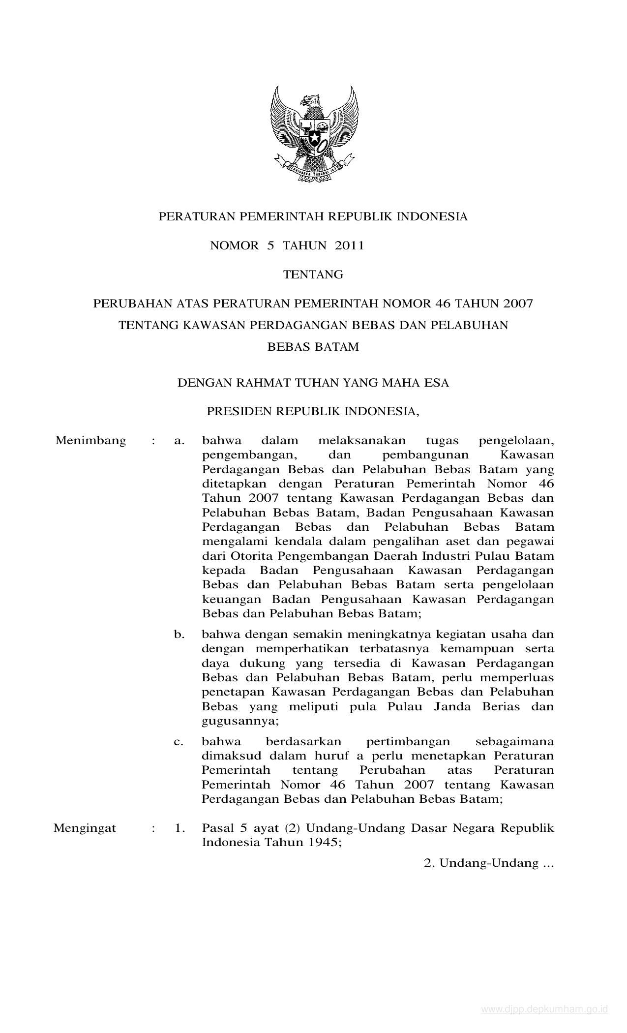 PP Nomor 5 Tahun 2011 | Peraturan Pemerintah Nomor 5 Tahun 2011 tentang PERUBAHAN ATAS PERATURAN PEMERINTAH NOMOR 46 TAHUN 2007 TENTANG KAWASAN PERDAGANGAN BEBAS DAN PELABUHAN BEBAS BATAM