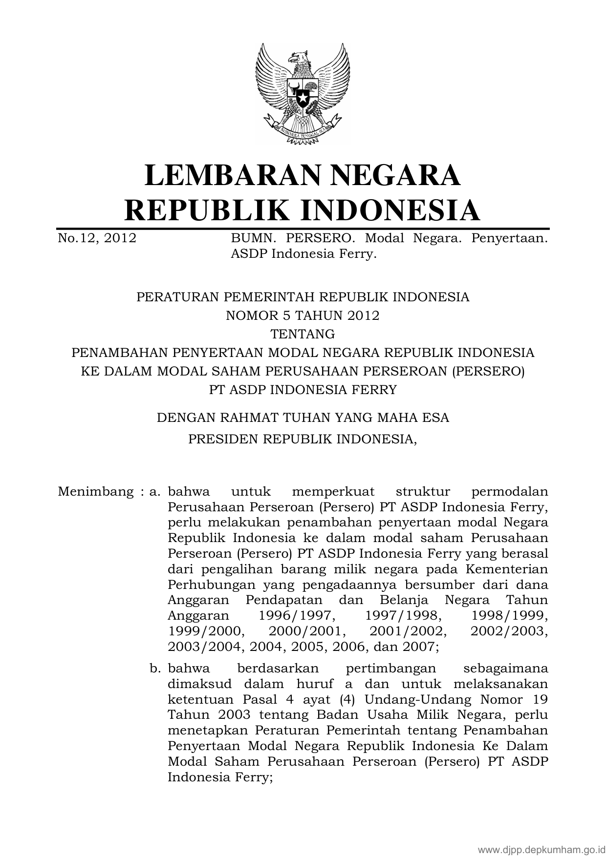 PP Nomor 5 Tahun 2012 | Peraturan Pemerintah Nomor 5 Tahun 2012 tentang PENAMBAHAN PENYERTAAN MODAL NEGARA REPUBLIK INDONESIA KE DALAM MODAL SAHAM PERUSAHAAN PERSEROAN (PERSERO) PT ASDP INDONESIA FERRY
