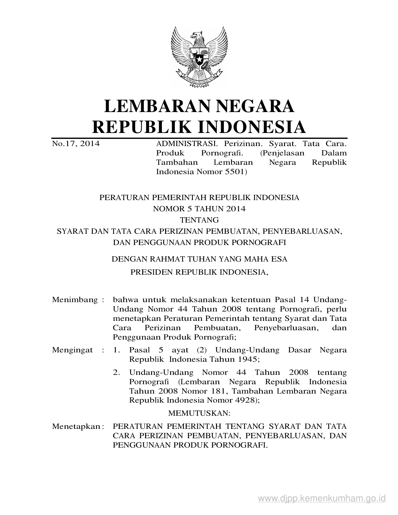 PP Nomor 5 Tahun 2014 | Peraturan Pemerintah Nomor 5 Tahun 2014 tentang SYARAT DAN TATA CARA PERIZINAN PEMBUATAN, PENYEBARLUASAN, DAN PENGGUNAAN PRODUK PORNOGRAFI