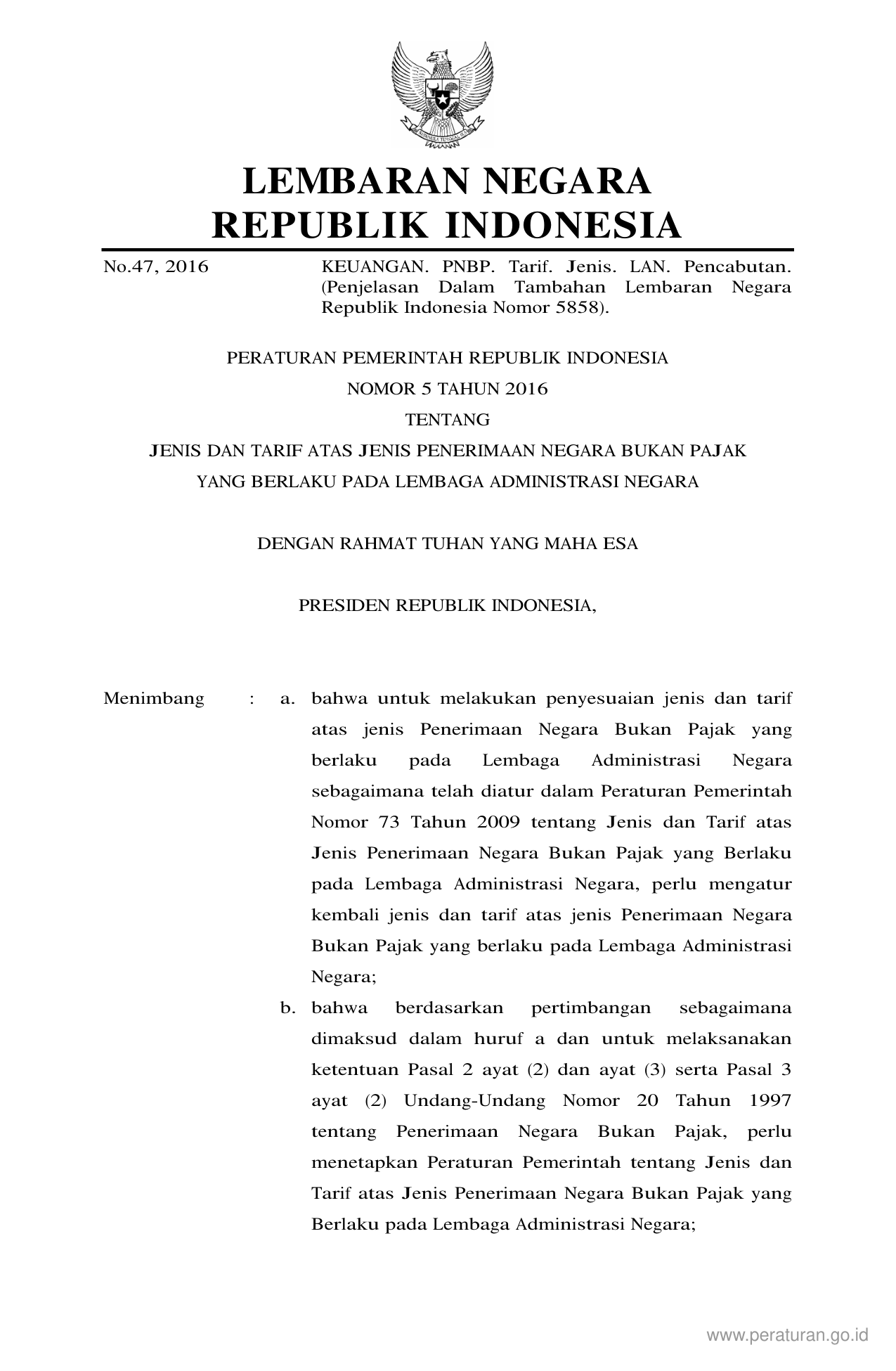 PP Nomor 5 Tahun 2016 | Peraturan Pemerintah Nomor 5 Tahun 2016 tentang JENIS DAN TARIF ATAS JENIS PENERIMAAN NEGARA BUKAN PAJAK YANG BERLAKU PADA LEMBAGA ADMINISTRASI NEGARA