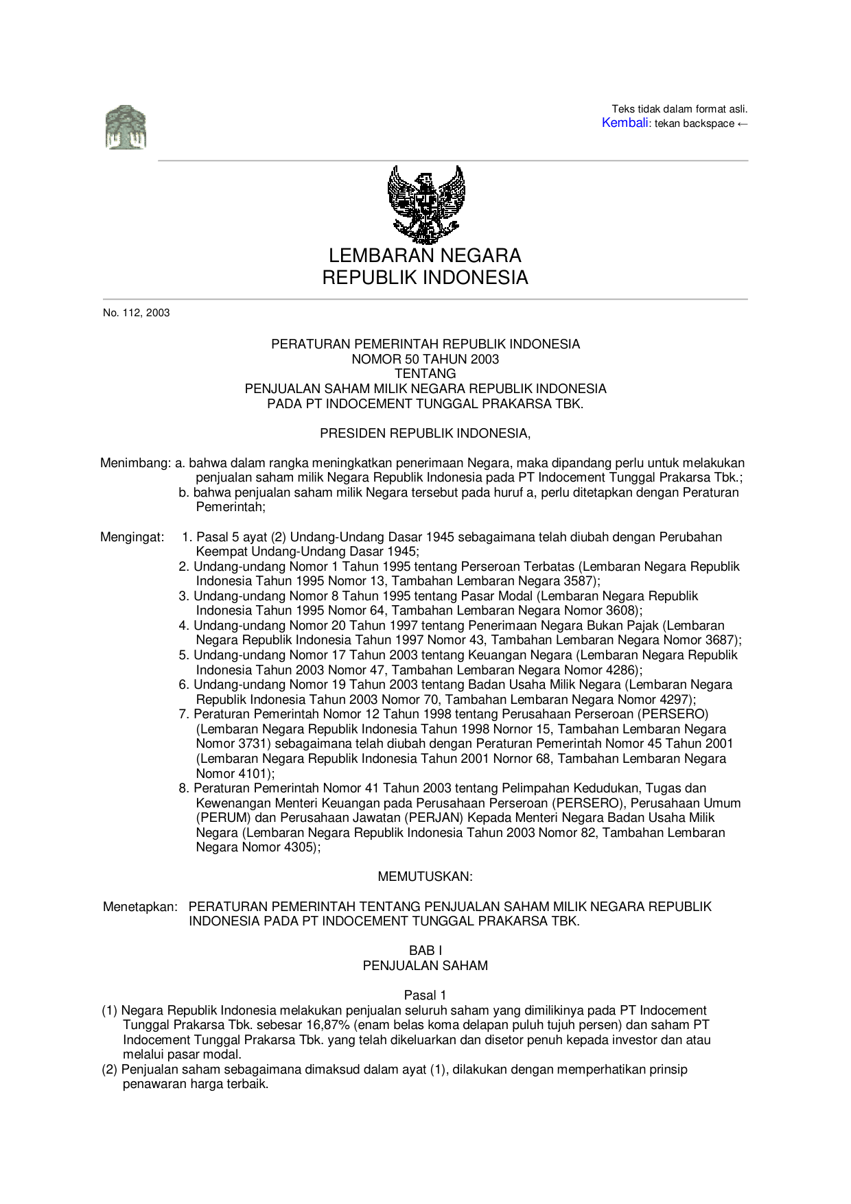 PP Nomor 50 Tahun 2003 | Peraturan Pemerintah Nomor 50 Tahun 2003 tentang PENJUALAN SAHAM MILIK NEGARA RI PADA PT INDOCEMENT TUNGGAL PRAKARSA TBK