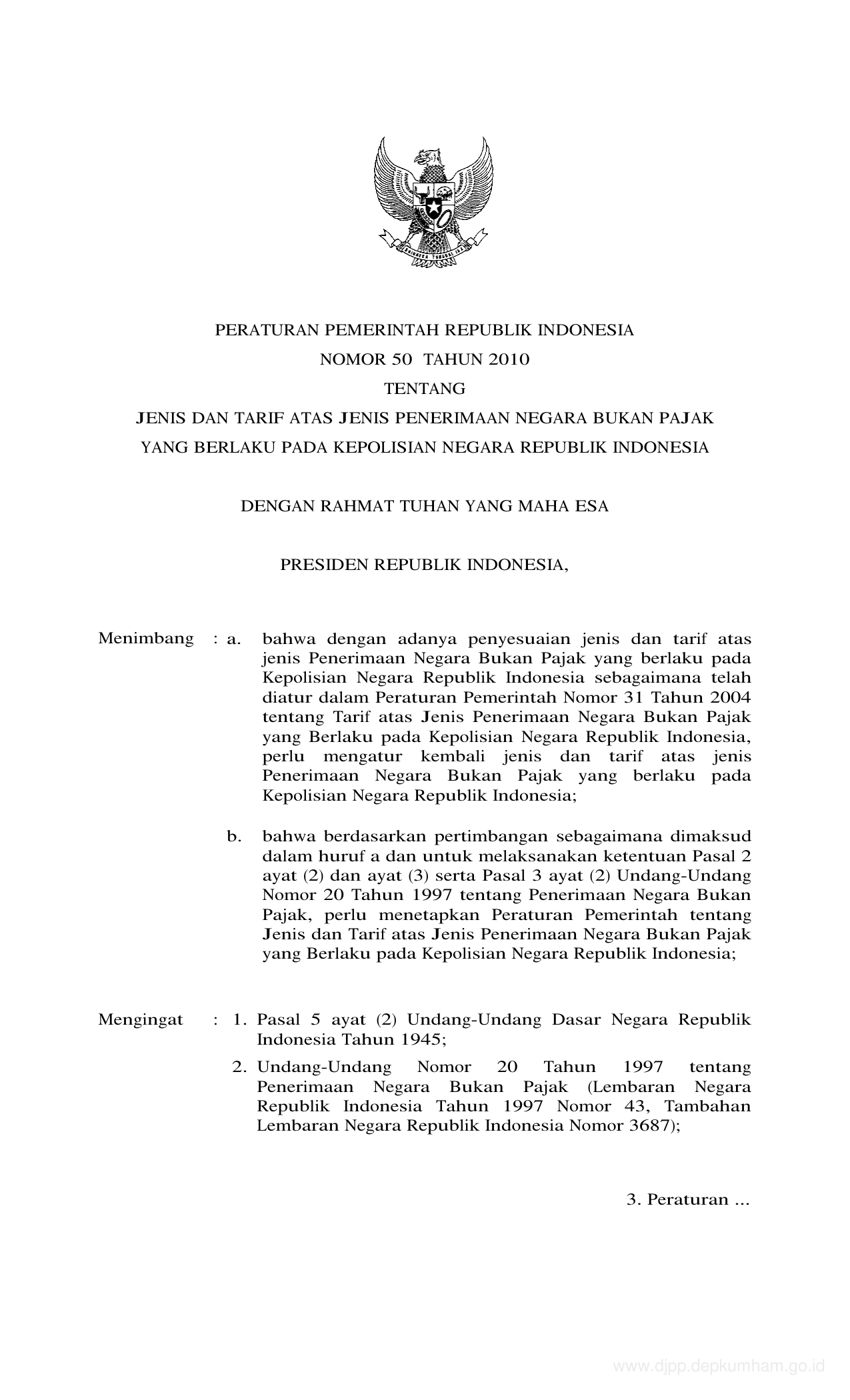 PP Nomor 50 Tahun 2010 | Peraturan Pemerintah Nomor 50 Tahun 2010 tentang JENIS DAN TARAF PENERIMAAN NEGARA BUKAN PAJAK YANG BERLAKU PADA KEPOLISIAN NEGARA REPUBLIK INDONESIA
