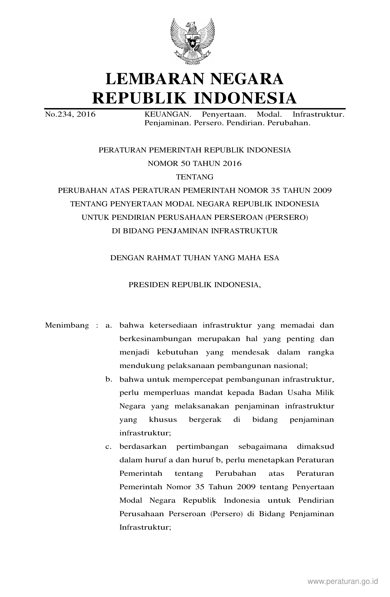 PP Nomor 50 Tahun 2016 | Peraturan Pemerintah Nomor 50 Tahun 2016 tentang Perubahan Atas Peraturan Pemerintah Nomor 35 Tahun 2009 Tentang Penyertaan Modal Negara Republik Indonesia Untuk Pendirian Perusahaan Perseroan (Persero) Di Bidang Penjaminan Infrastruktur