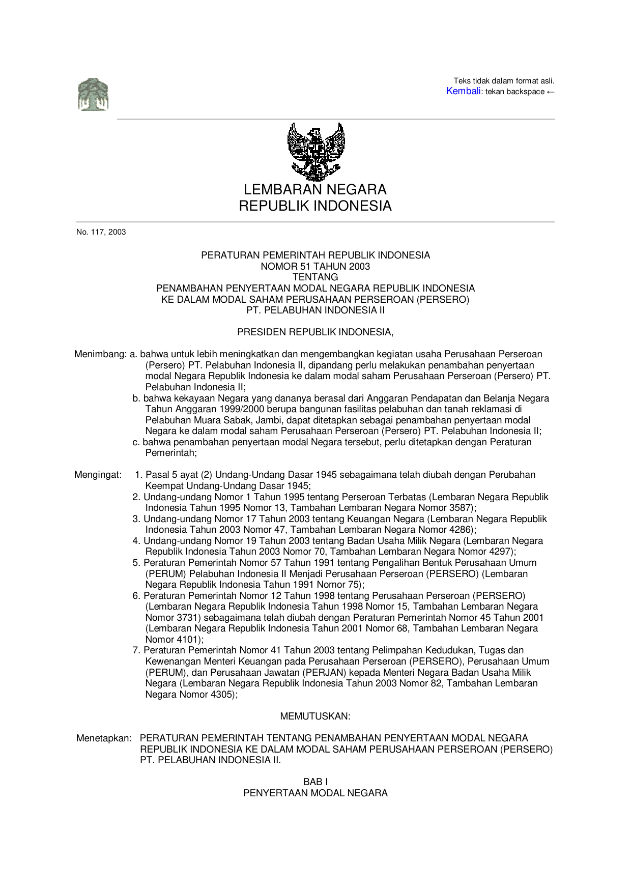 PP Nomor 51 Tahun 2003 | Peraturan Pemerintah Nomor 51 Tahun 2003 tentang PENAMBAHAN PENYERTAAN MODAL NEGARA RI KE DALAM MODAL SAHAM PERUSAHAAN PERSEROAN (PERSERO) PT. PELABUHAN INDONESIA II