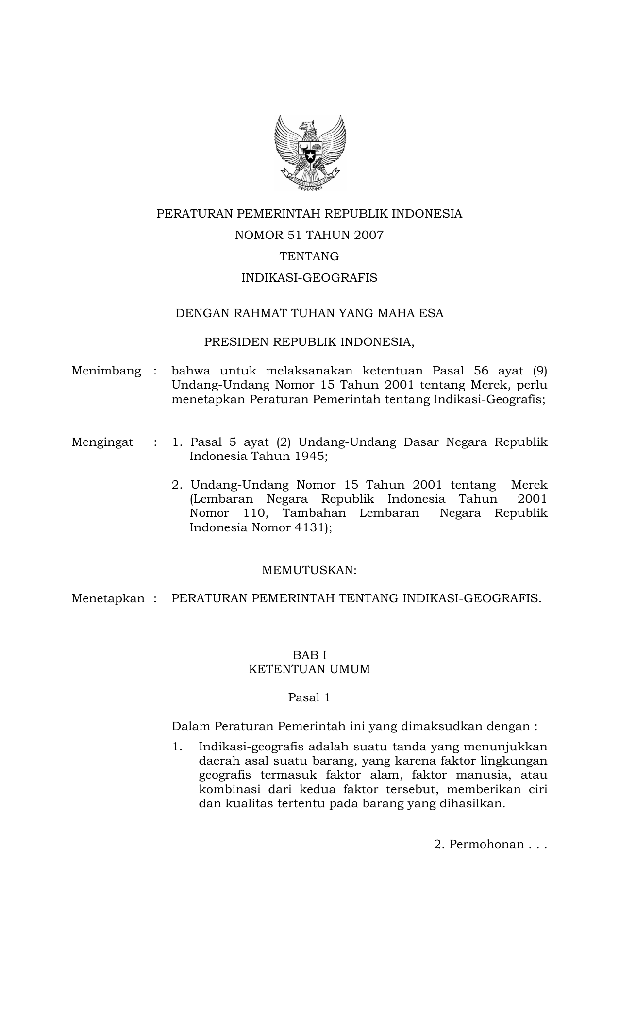 PP Nomor 51 Tahun 2007 | Peraturan Pemerintah Nomor 51 Tahun 2007 tentang INDIKASI GEOGRAFIS