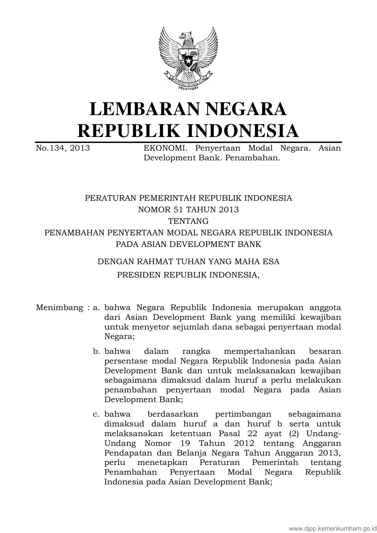 PP Nomor 51 Tahun 2013 | Peraturan Pemerintah Nomor 51 Tahun 2013 tentang PENAMBAHAN PENYERTAAN MODAL NEGARA REPUBLIK INDONESIA PADA ASIAN DEVELOPMENT BANK