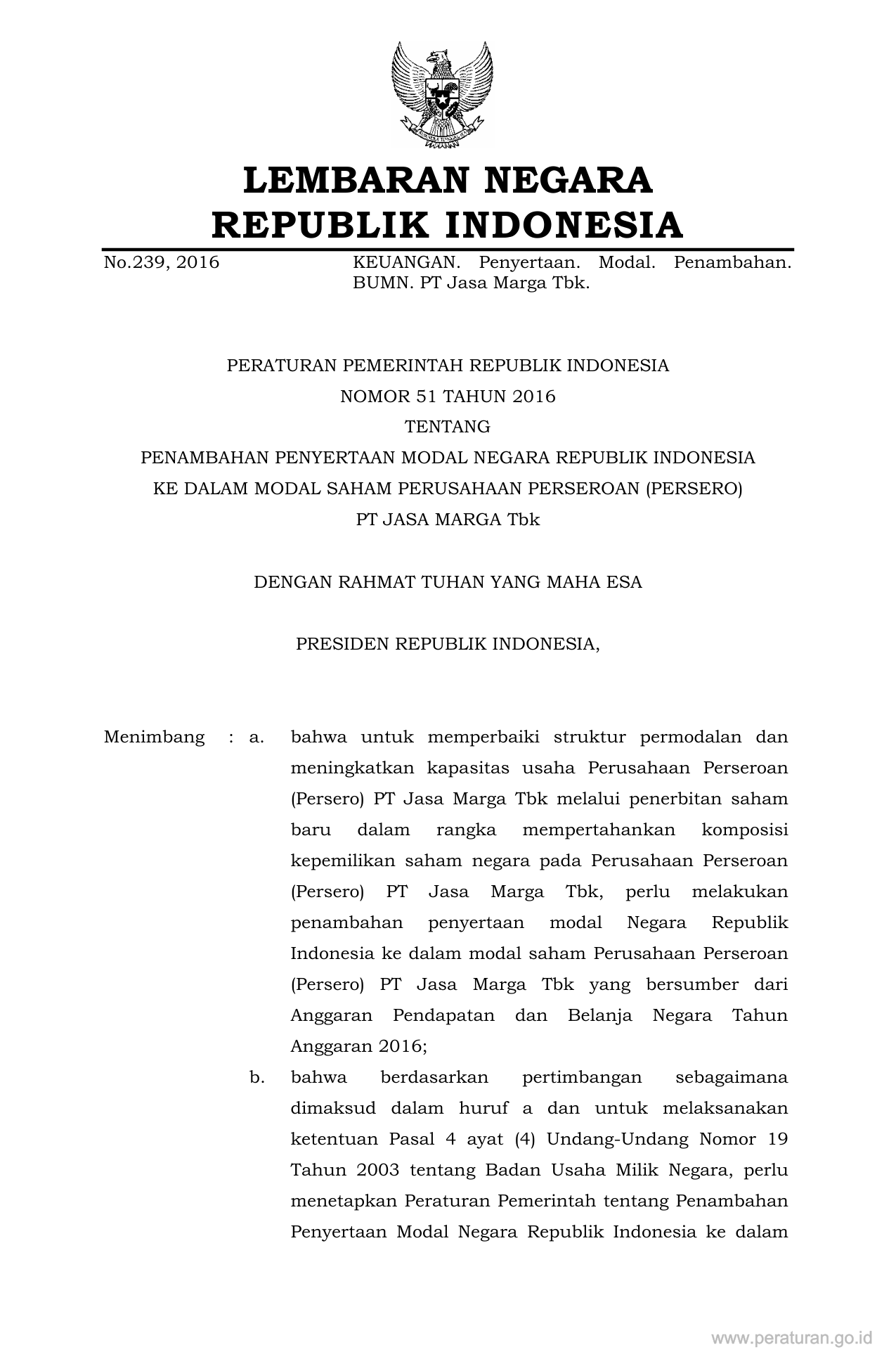 PP Nomor 51 Tahun 2016 | Peraturan Pemerintah Nomor 51 Tahun 2016 tentang Penambahan Penyertaan Modal Negara Republik Indonesia Ke Dalam Modal Saham Perusahaan Perseroan (Persero) PT Jasa Marga Tbk