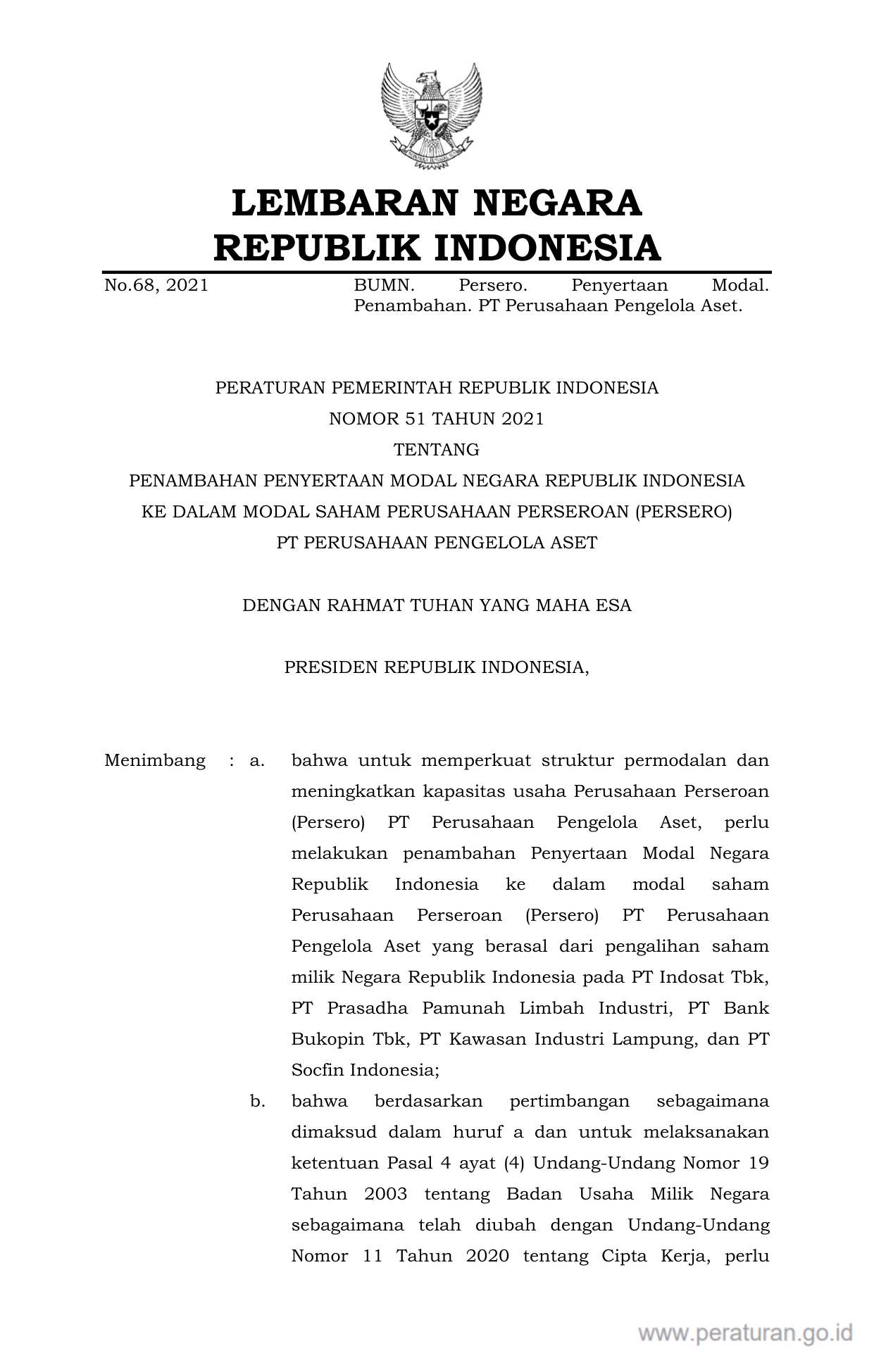 PP Nomor 51 Tahun 2021 | Peraturan Pemerintah Nomor 51 Tahun 2021 tentang PENAMBAHAN PENYERTAAN MODAL NEGARA REPUBLIK INDONESIA KE DALAM MODAL SAHAM PERUSAHAAN PERSEROAN (PERSERO) PT PERUSAHAAN PENGELOLA ASET