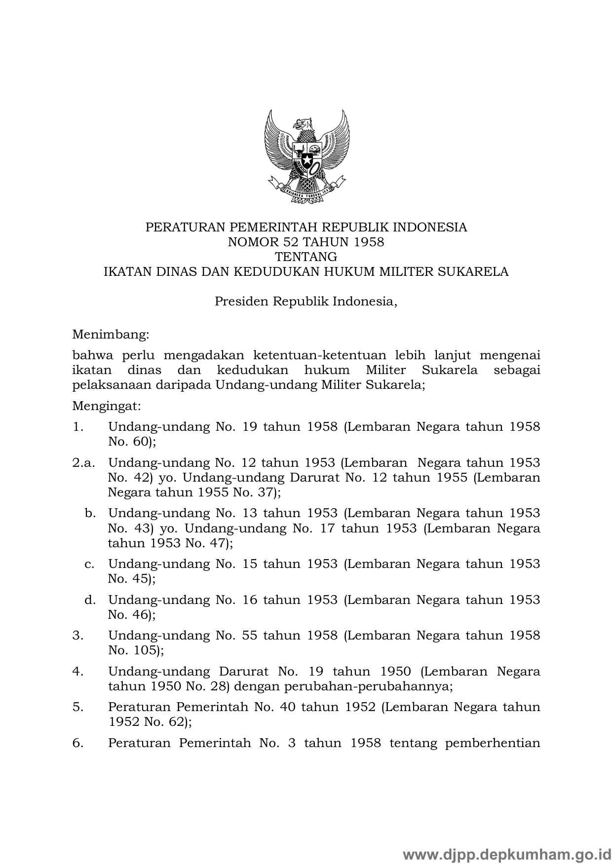 PP Nomor 52 Tahun 1958 | Peraturan Pemerintah Nomor 52 Tahun 1958 tentang IKATAN DINAS DAN KEDUDUKAN HUKUM MILITER SUKARELA