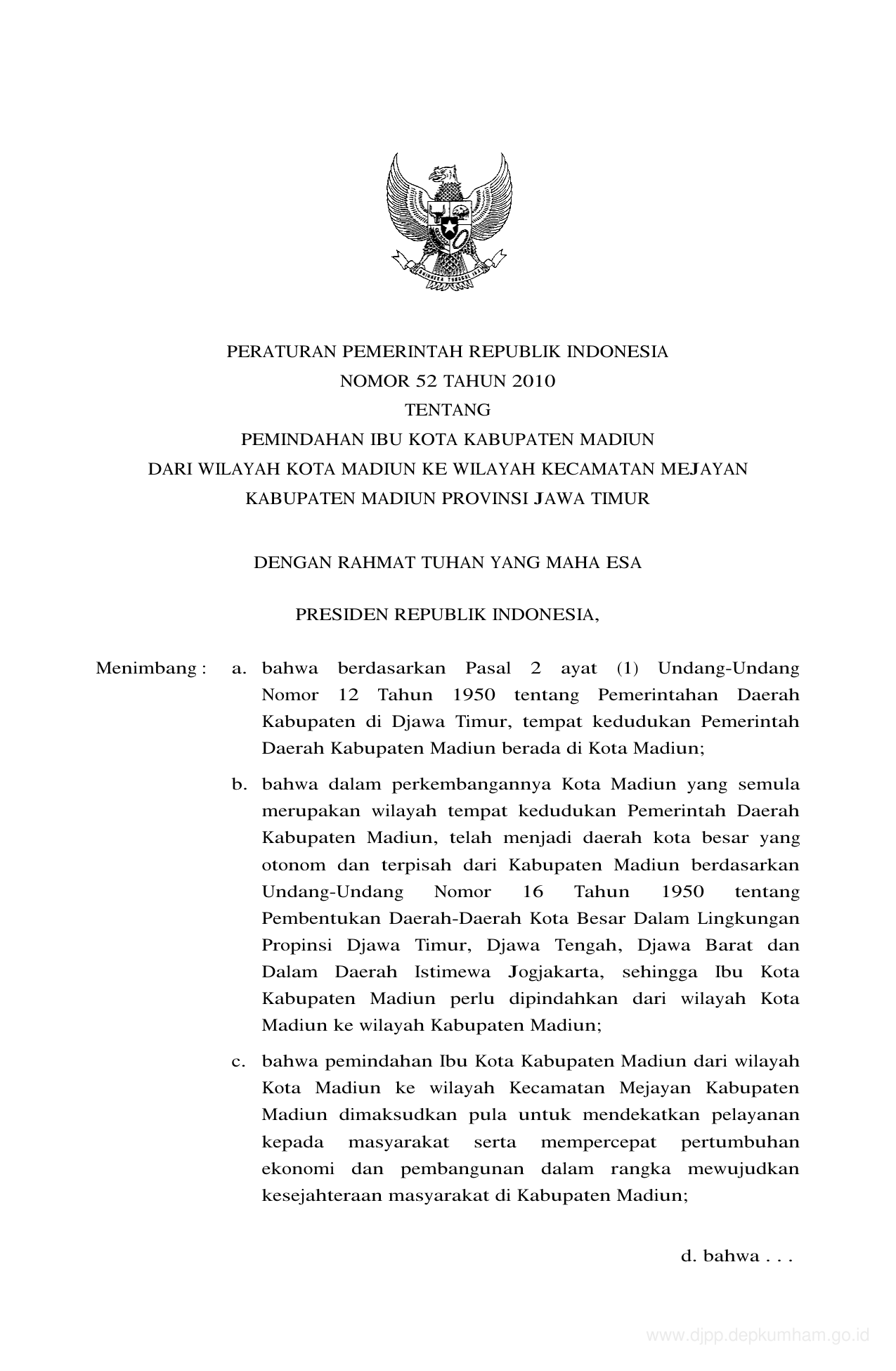 PP Nomor 52 Tahun 2010 | Peraturan Pemerintah Nomor 52 Tahun 2010 tentang PEMINDAHAN IBUKOTA KABUPATEN MADIUN DARI WILAYAH KOTA MADIUN KE WILAYAH KECAMATAN MEJAYAN KABUPATEN MADIUN PROVINSI JAWA TIMUR
